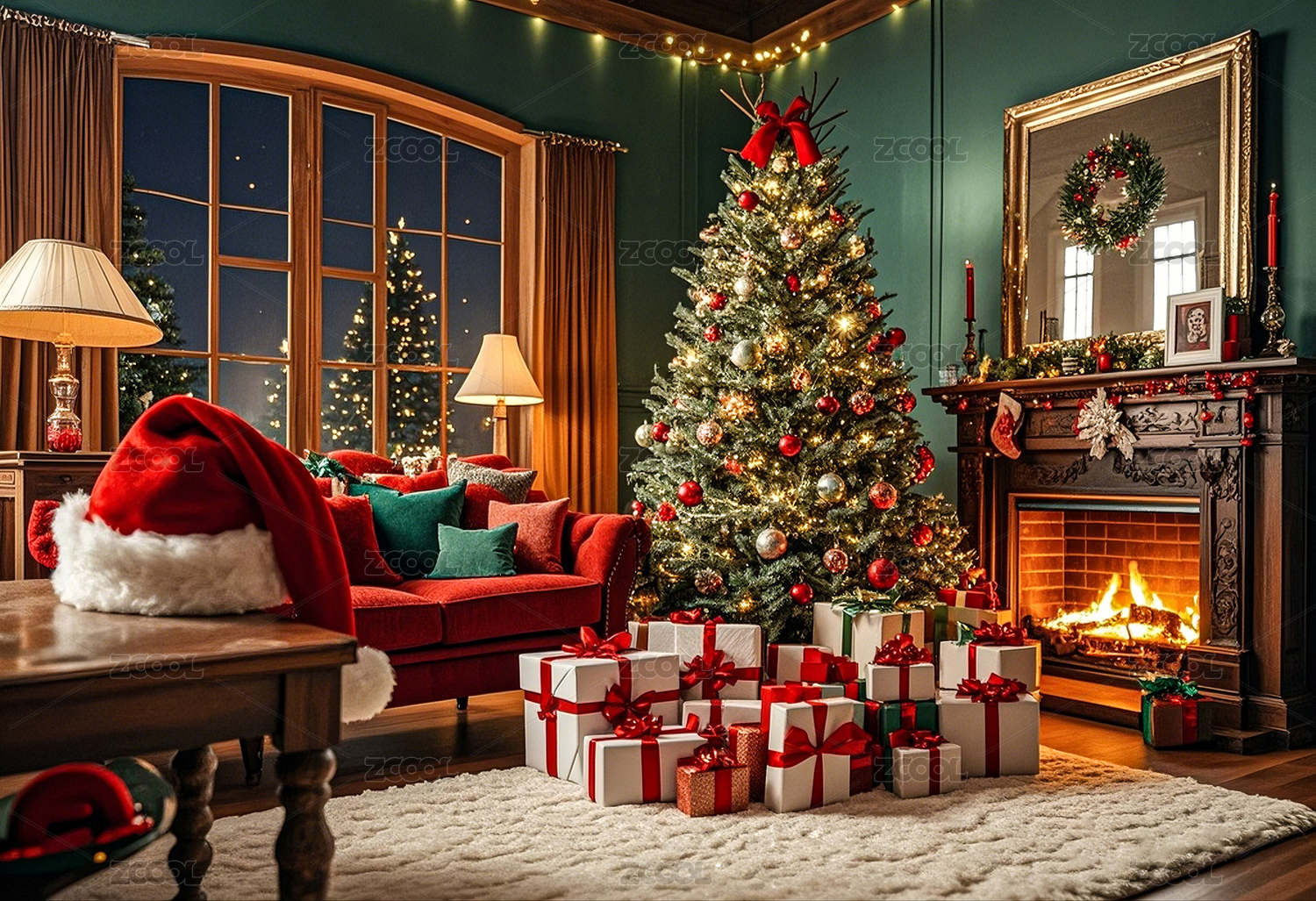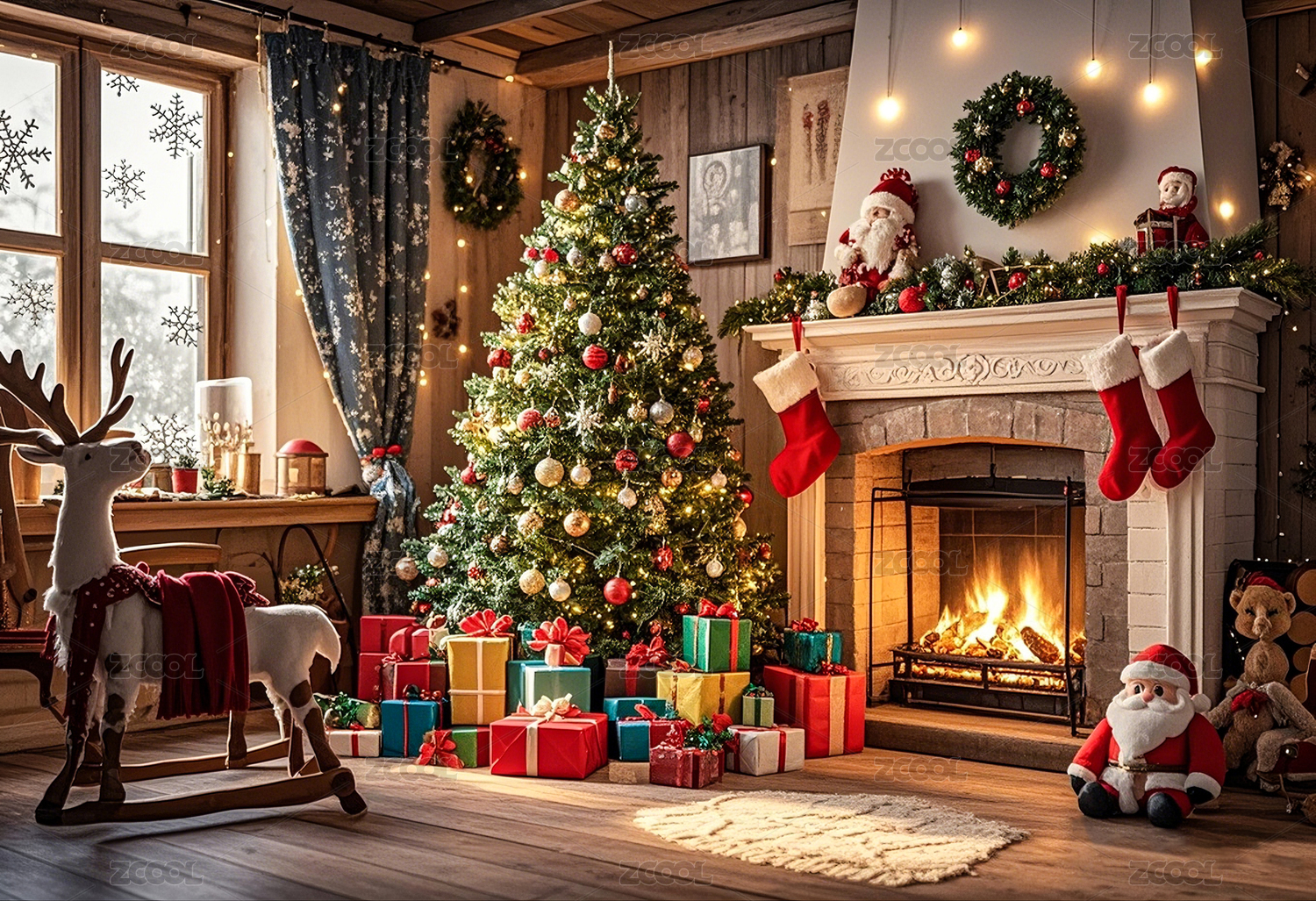圣诞节,圣诞树,圣诞老人,麋鹿,壁炉,礼物,红绿配色,DXCZ202402,海报,设计