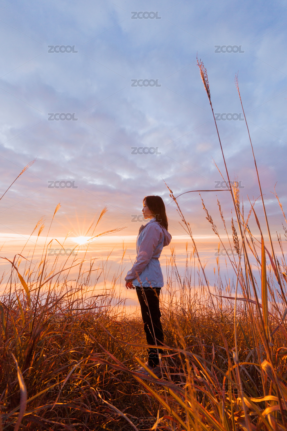 美丽气质女孩在游轮上面对蓝色大海的夕阳