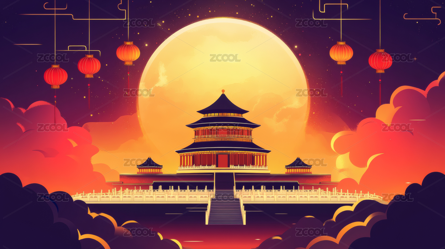 北京故宫国潮喜庆节日中秋古建孔明灯插画