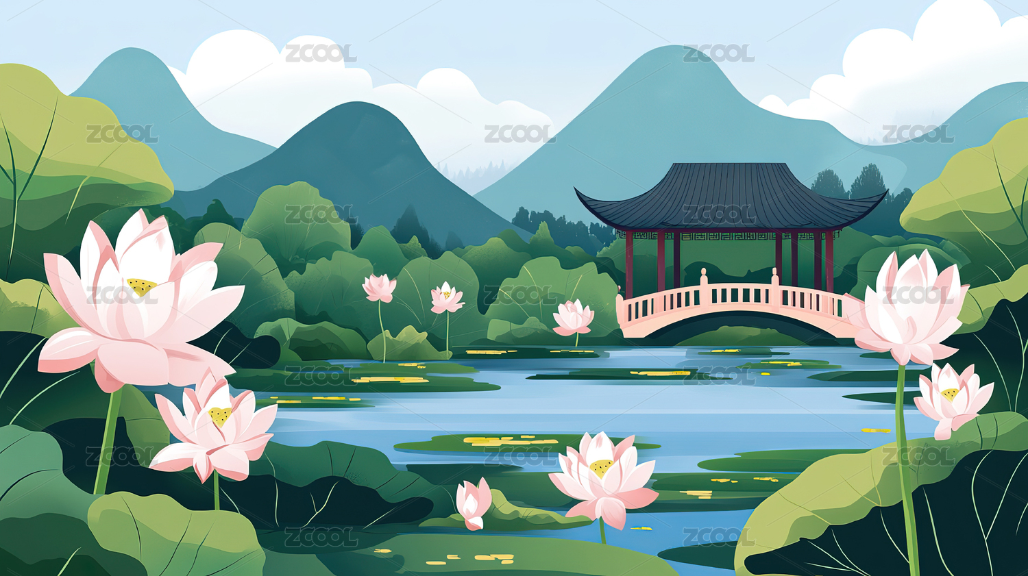 国风,夏天,夏季,春意,远山,山水,国潮,荷花,柳树,山