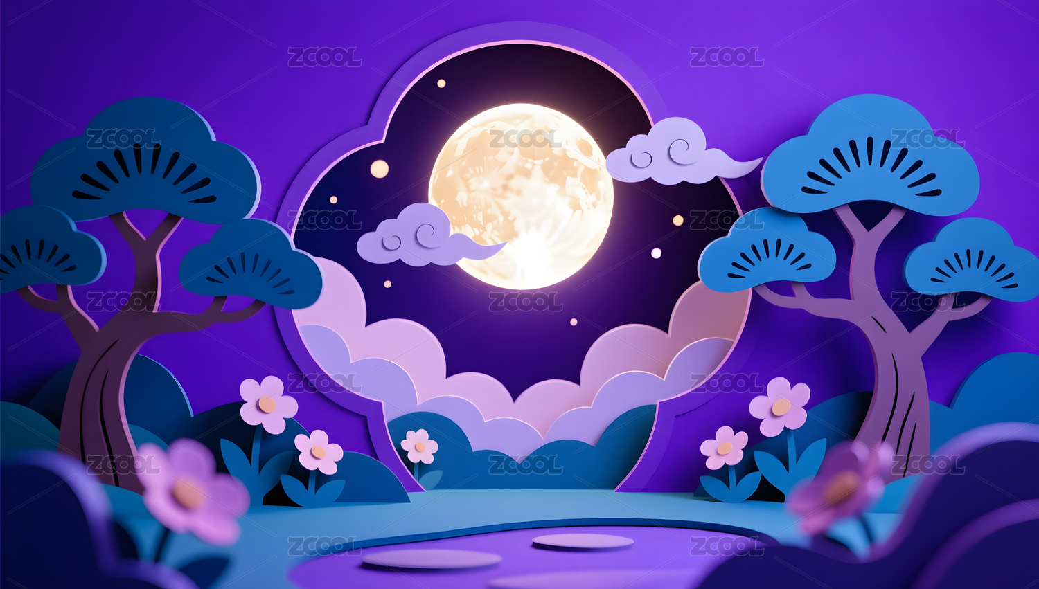 中秋节氛围感月到中秋剪纸风格艺术插画
