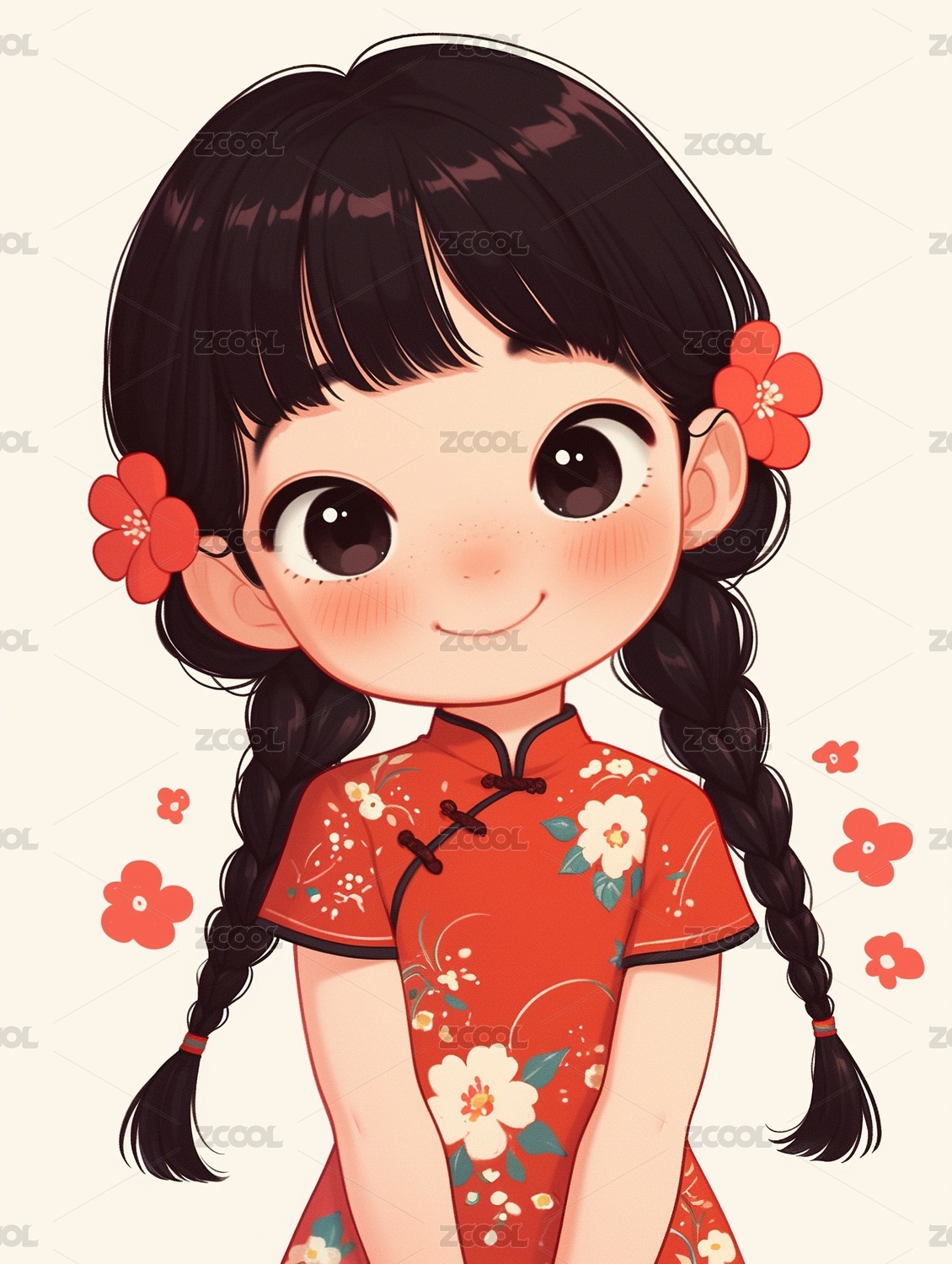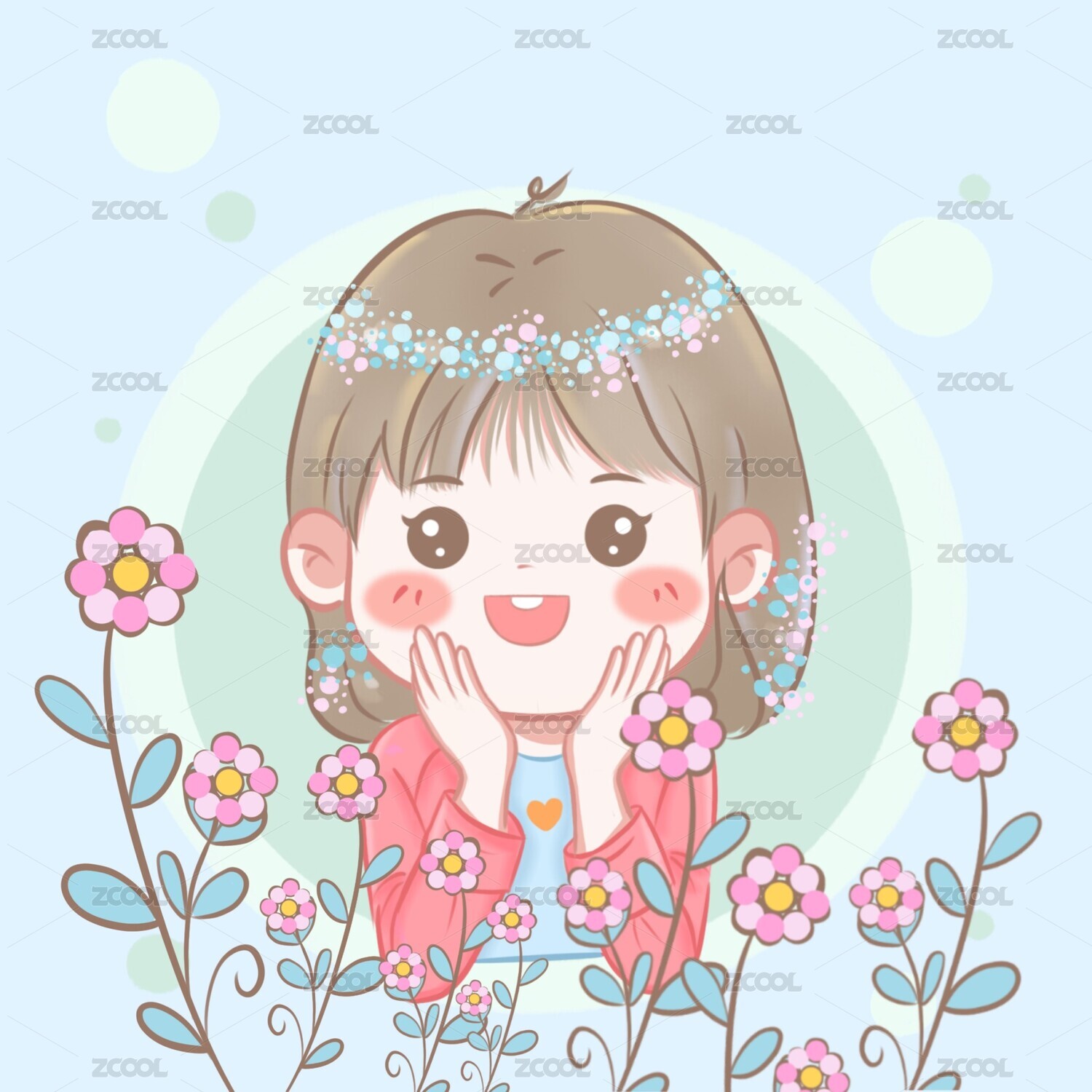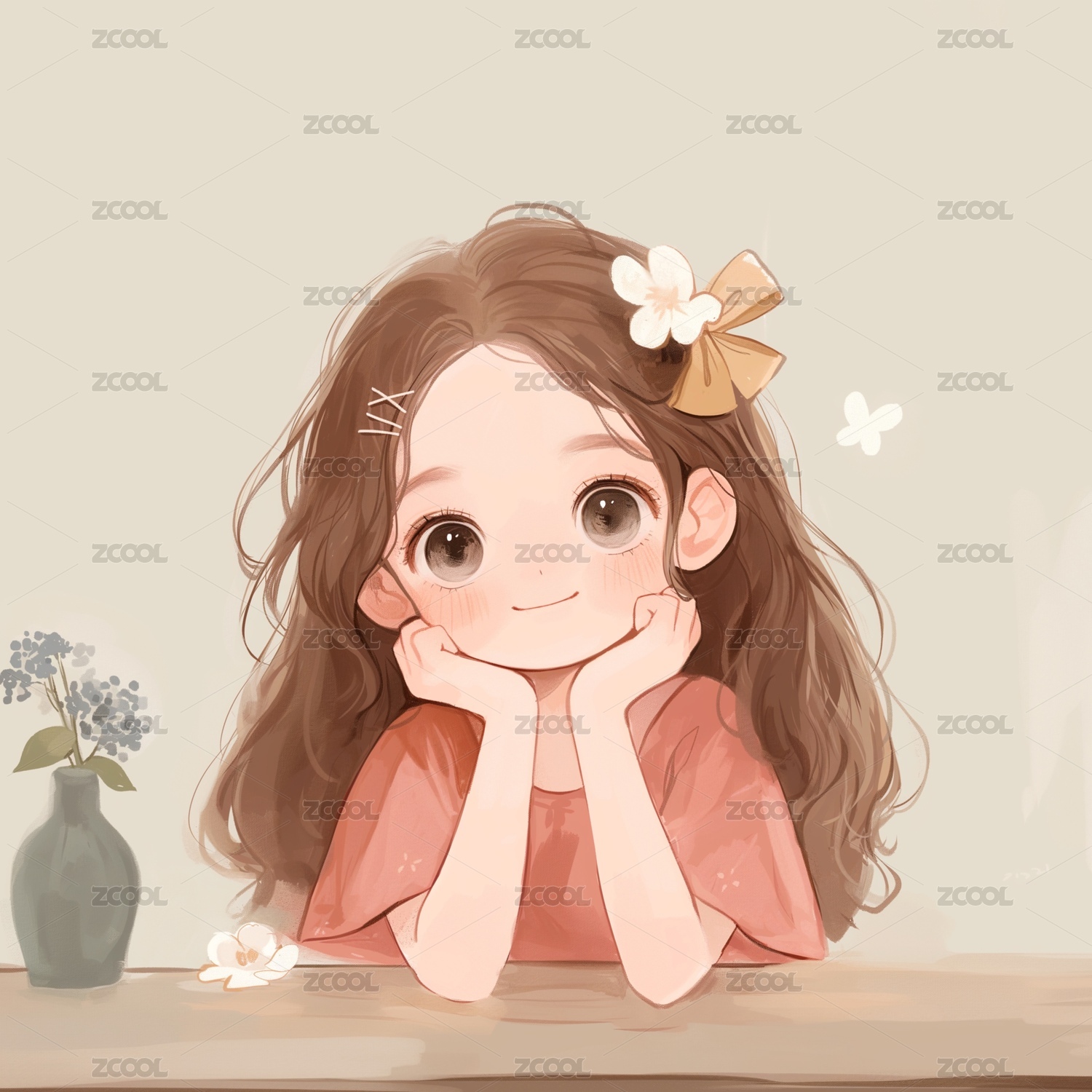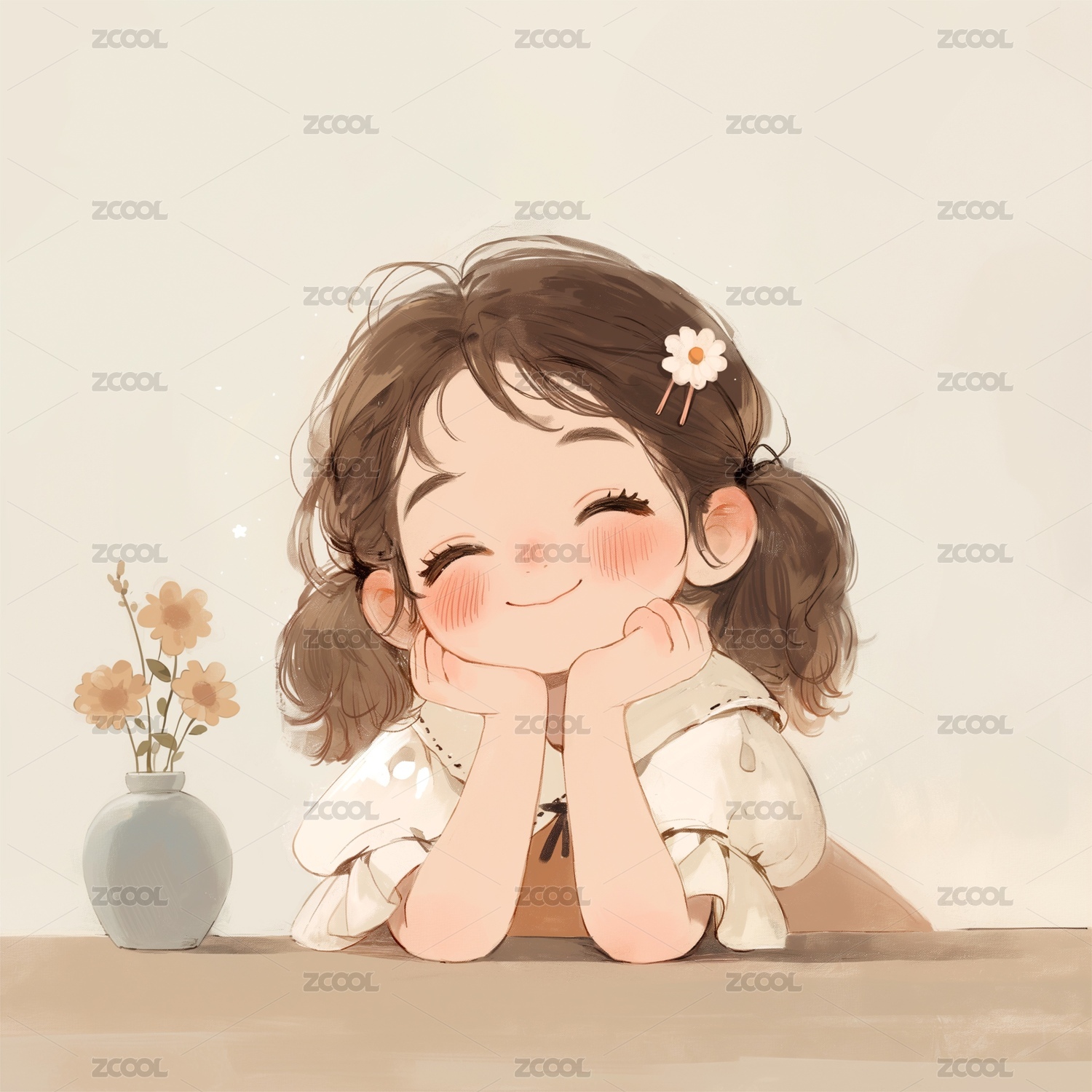 温暖水彩-盘发戴着花低头闭眼的小女孩