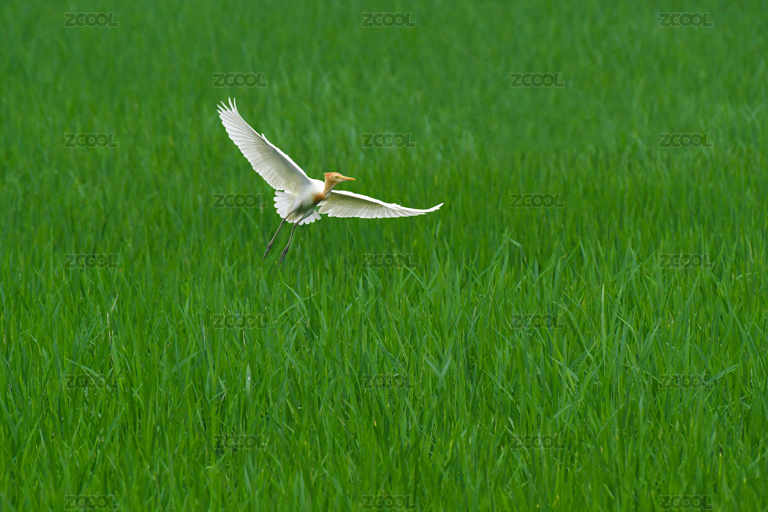 一只牛背鹭从一片绿色稻田上空飞翔掠过