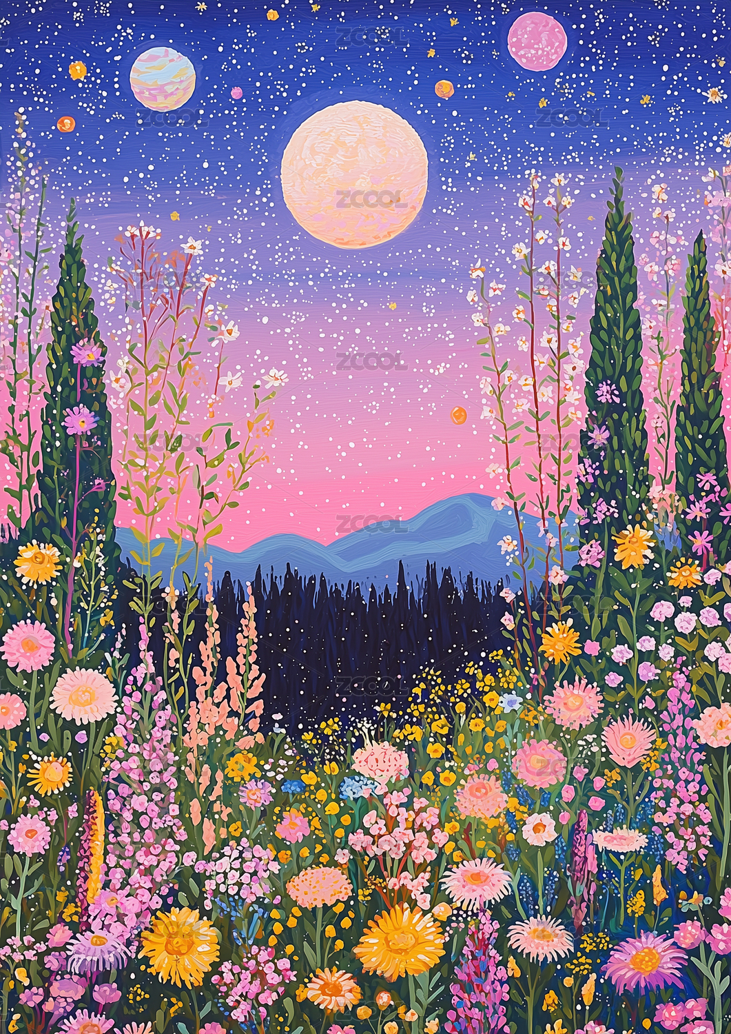 月亮,植物,花,湖边,云,风景,海报,几何,抽象,艺术