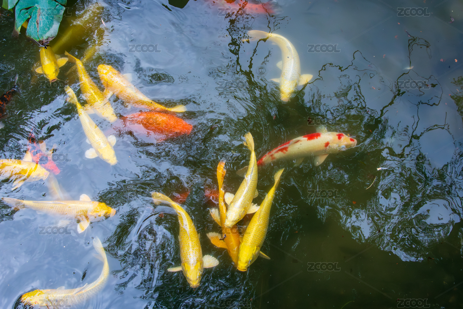 池塘中颜色艳丽追逐嬉戏的锦鲤