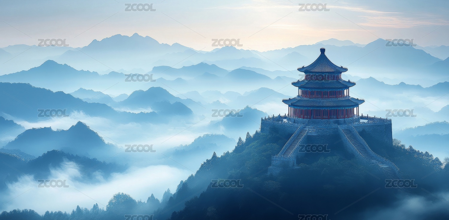 日落的长城,远处的雾和层层叠叠的山脉轮廓