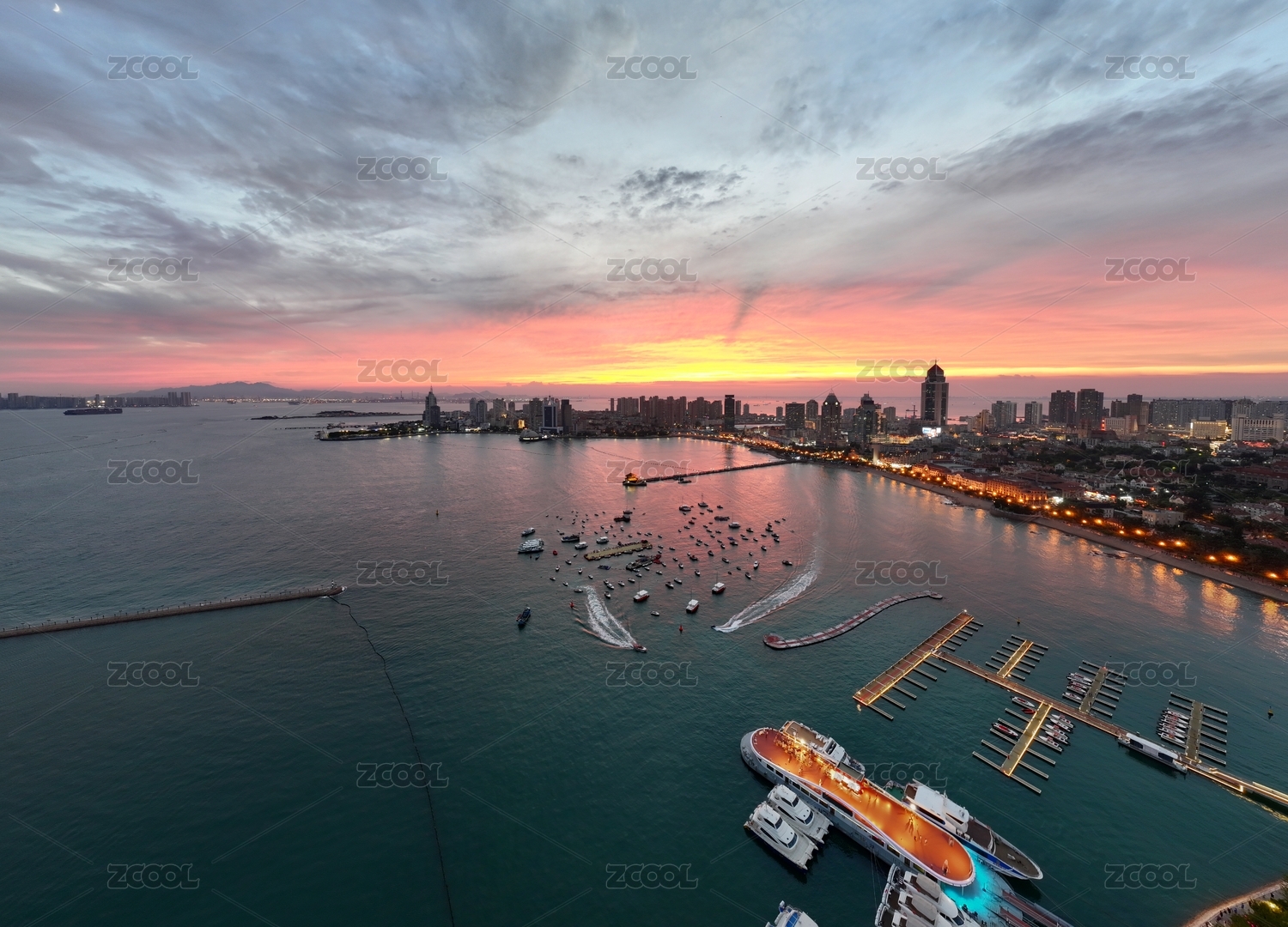航拍青岛海岸线港口邮轮母港