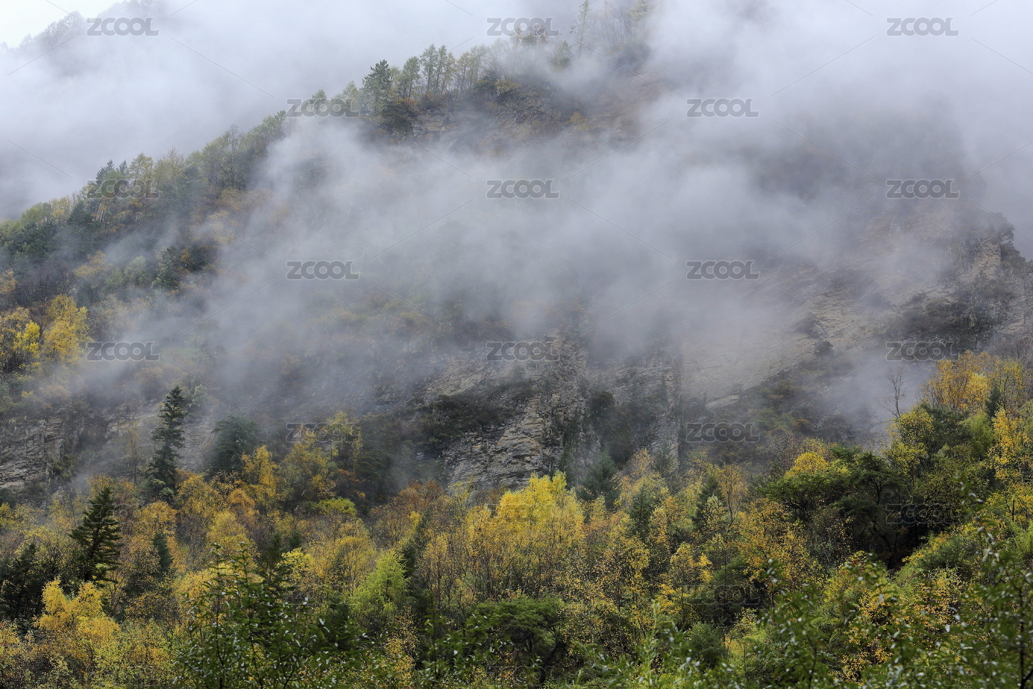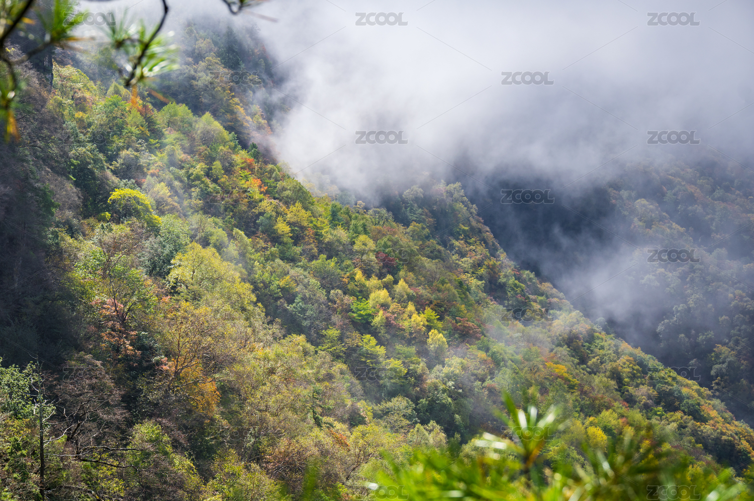 初秋季节云雾缭绕的山地森林风光