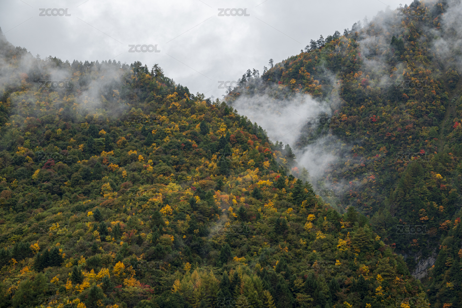 中国四川阿坝州茂县云雾缭绕高山彩林秋色