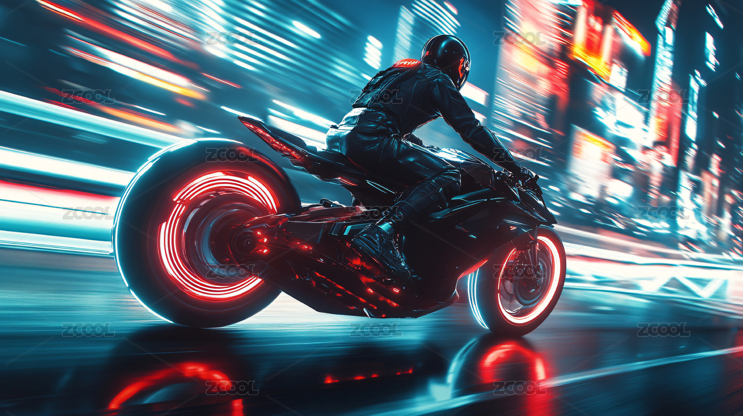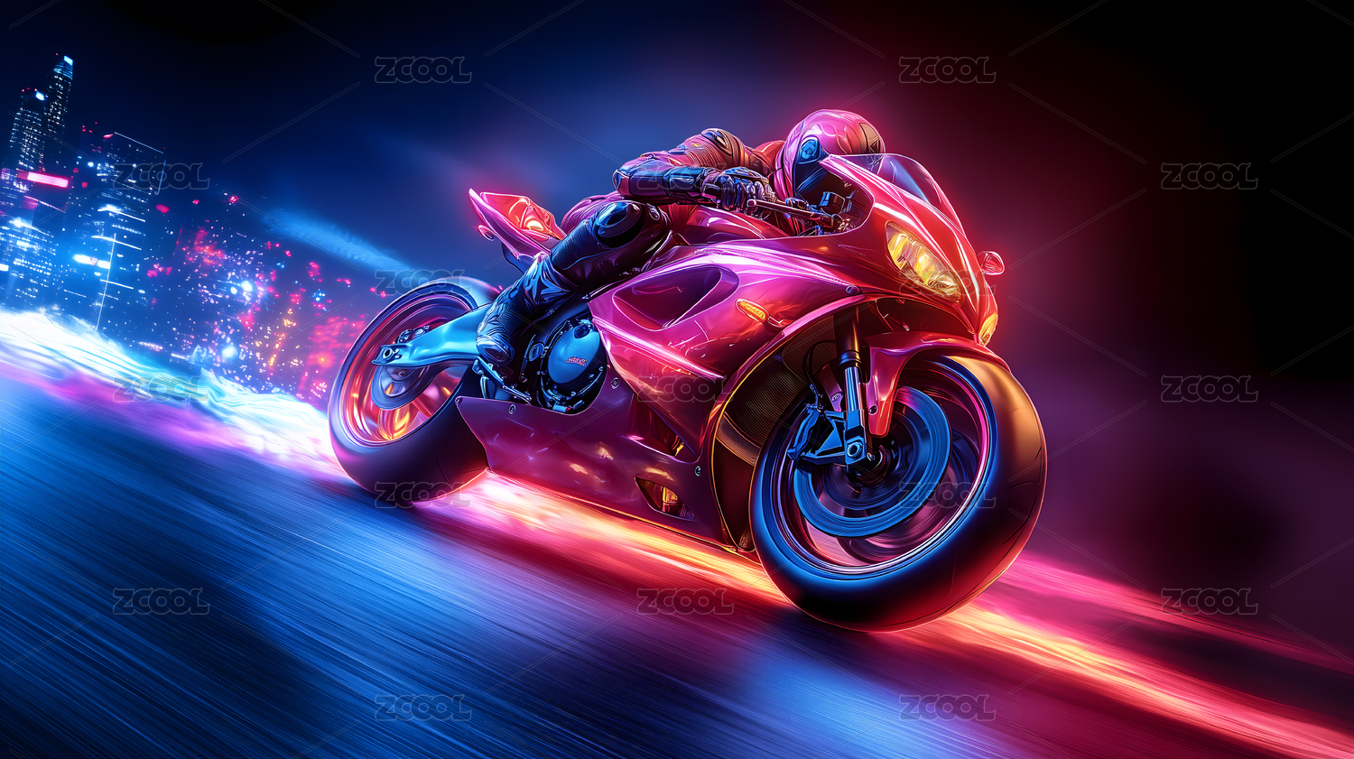 一个骑手骑着科技感摩托车在霓虹灯中行驶