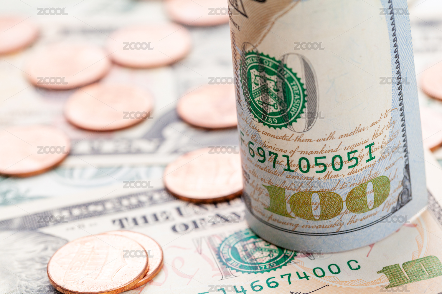 美元卷币与硬币散落桌面