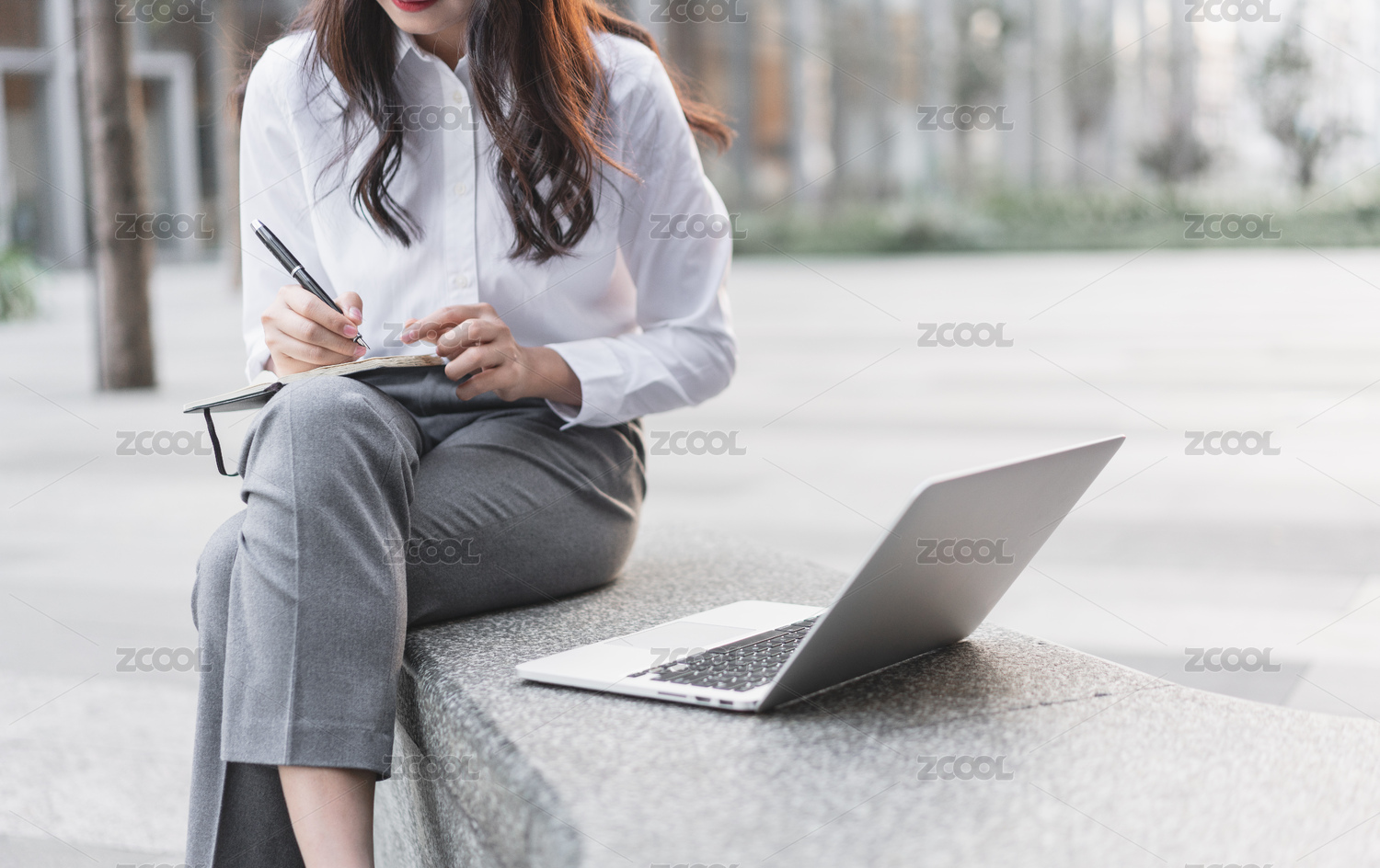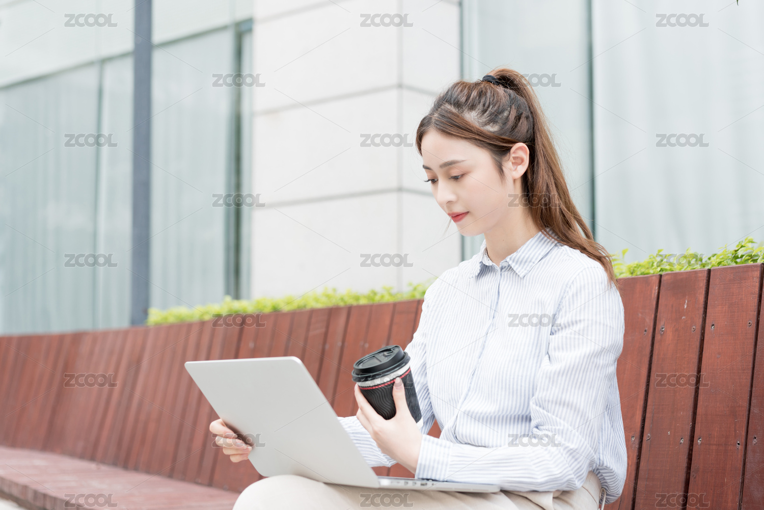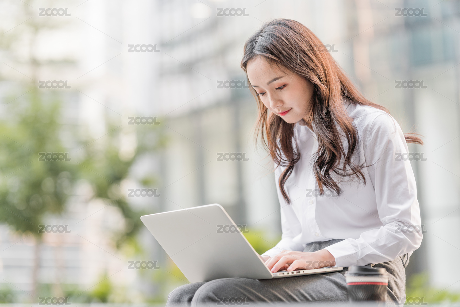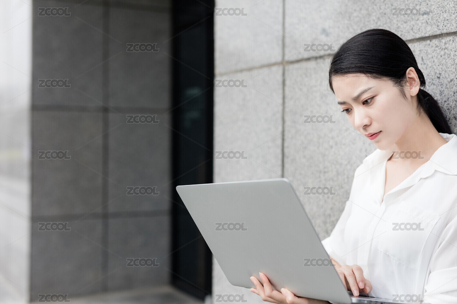 商务楼下使用电脑办公的青年女性