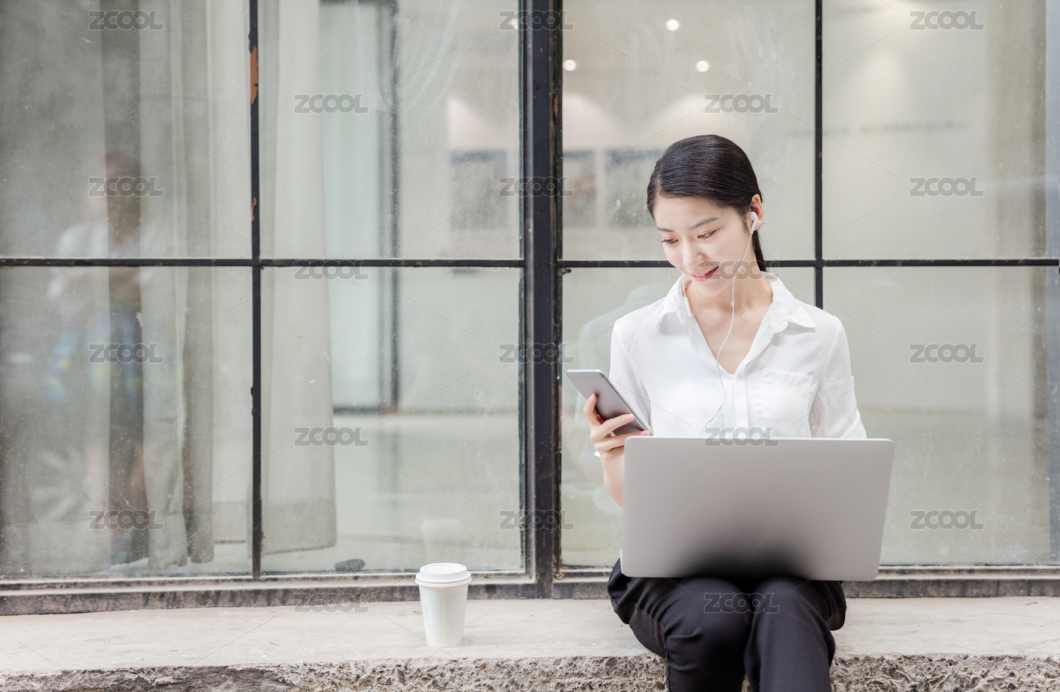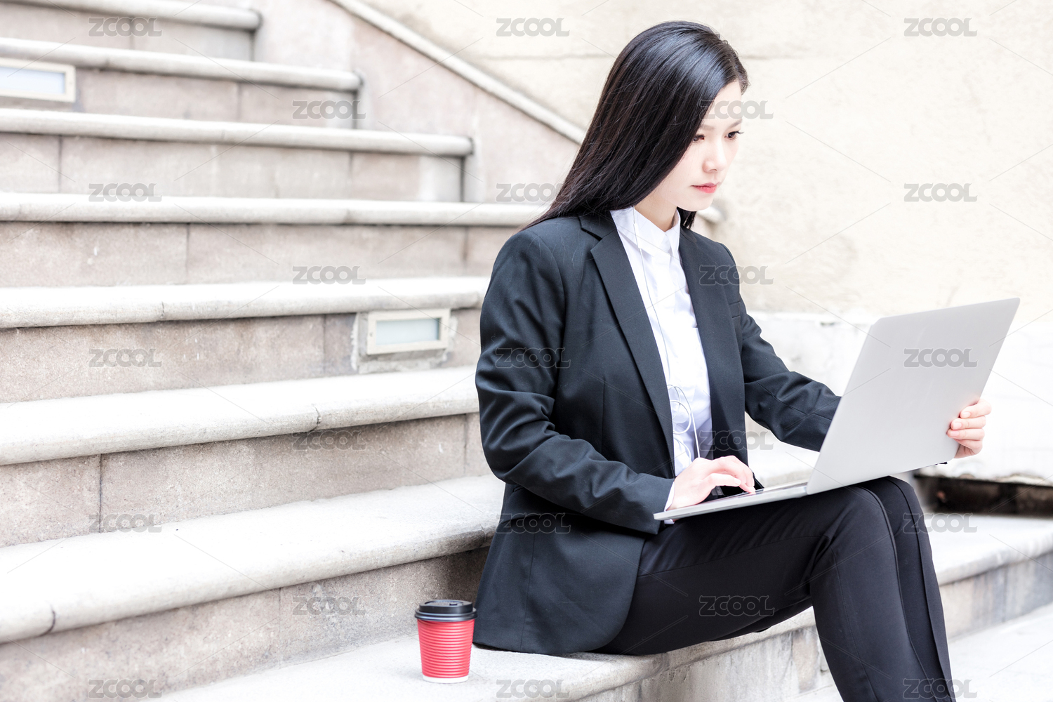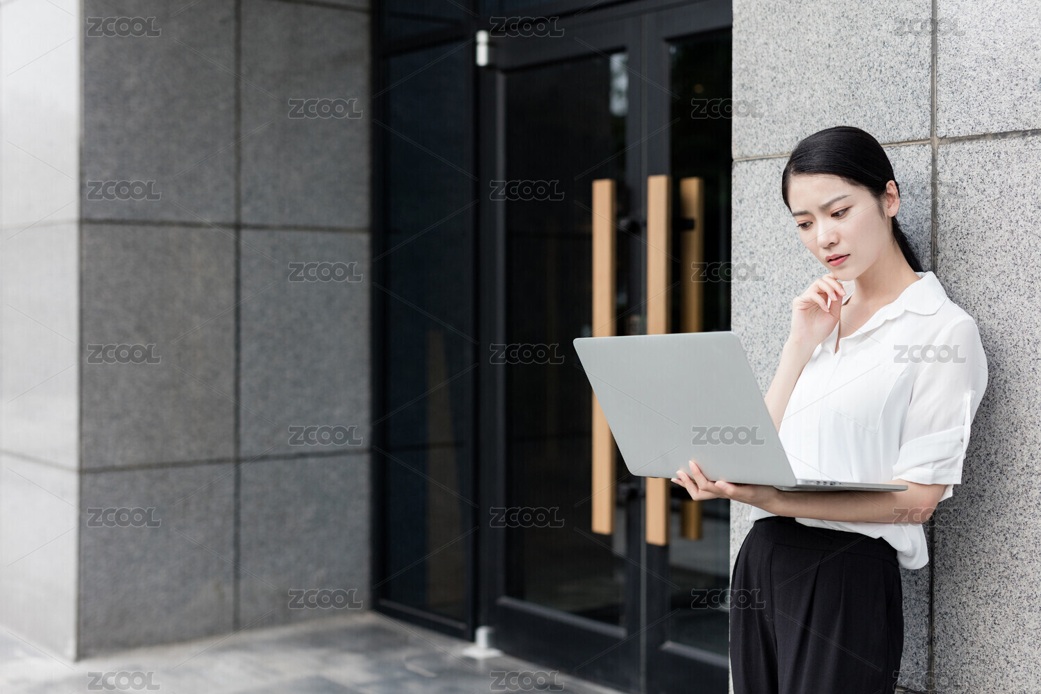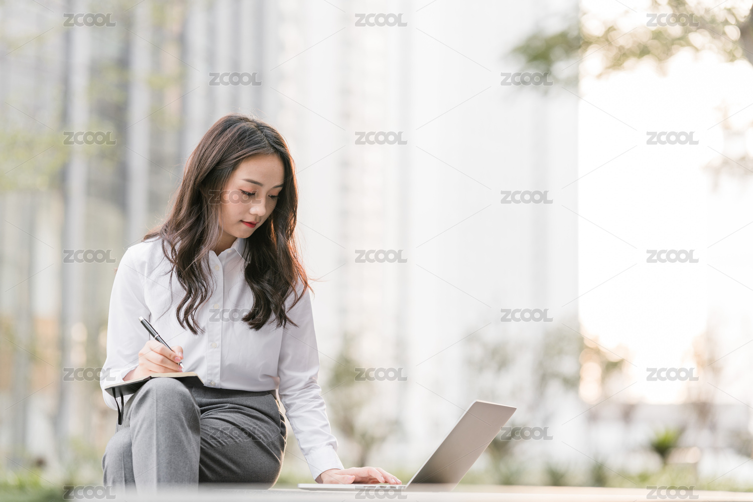 商务楼下使用电脑办公的青年女性