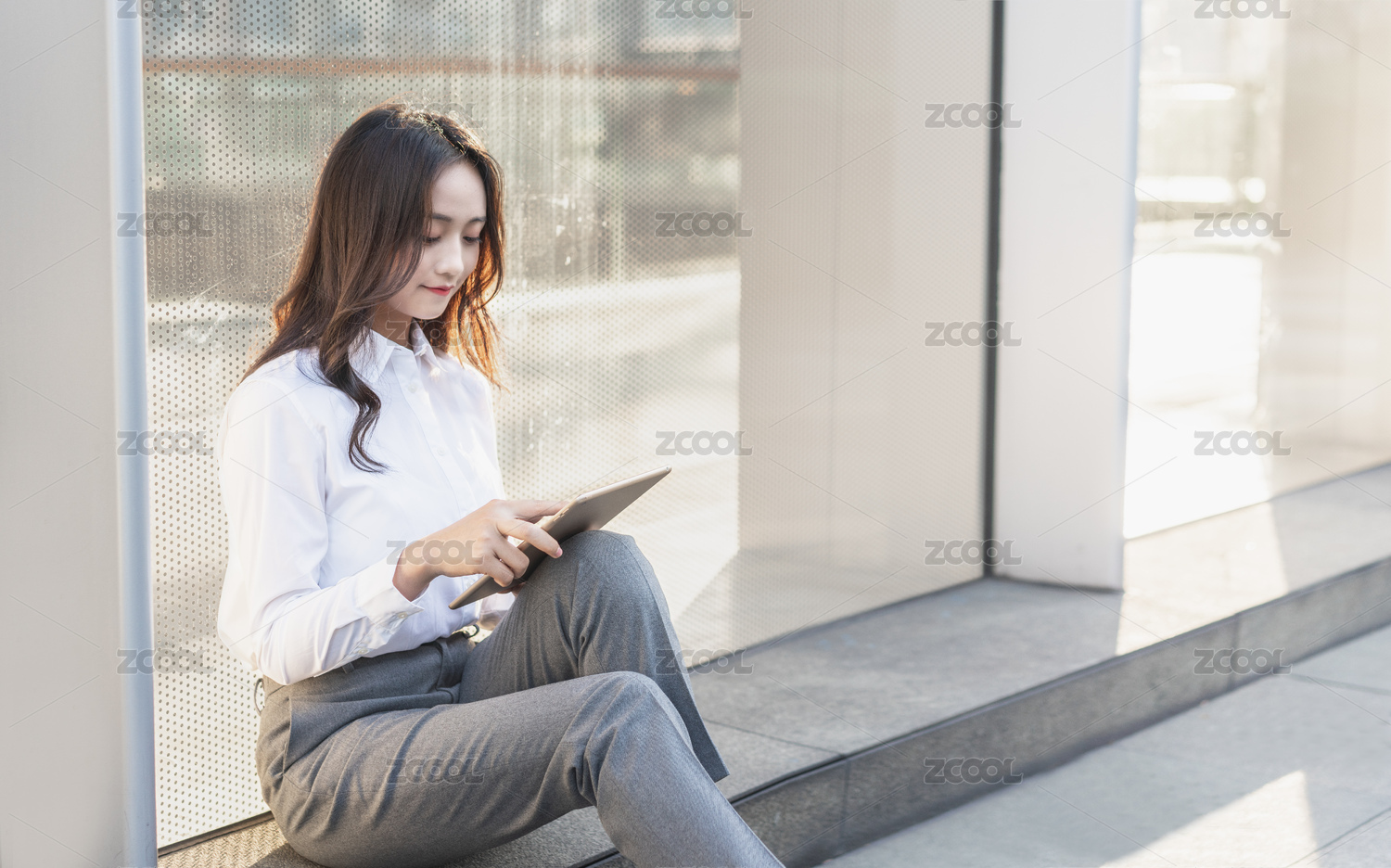 亚洲商务人士坐在户外看平板电脑