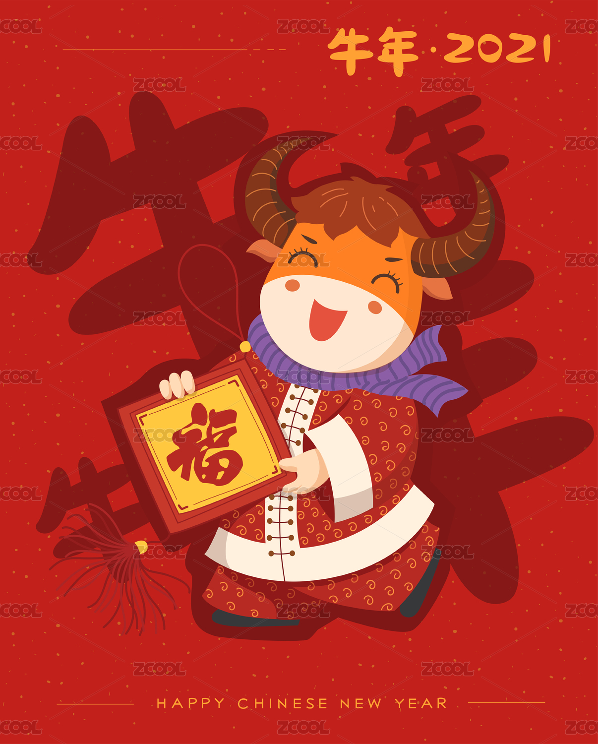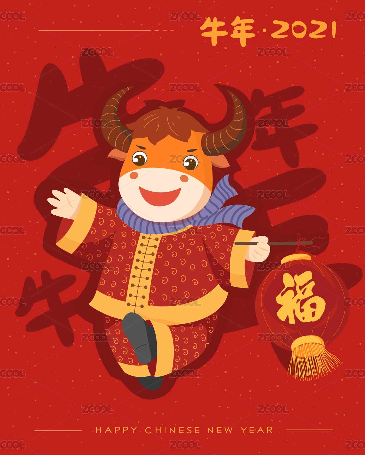 牛年可爱小牛拿福字灯笼矢量插画海报