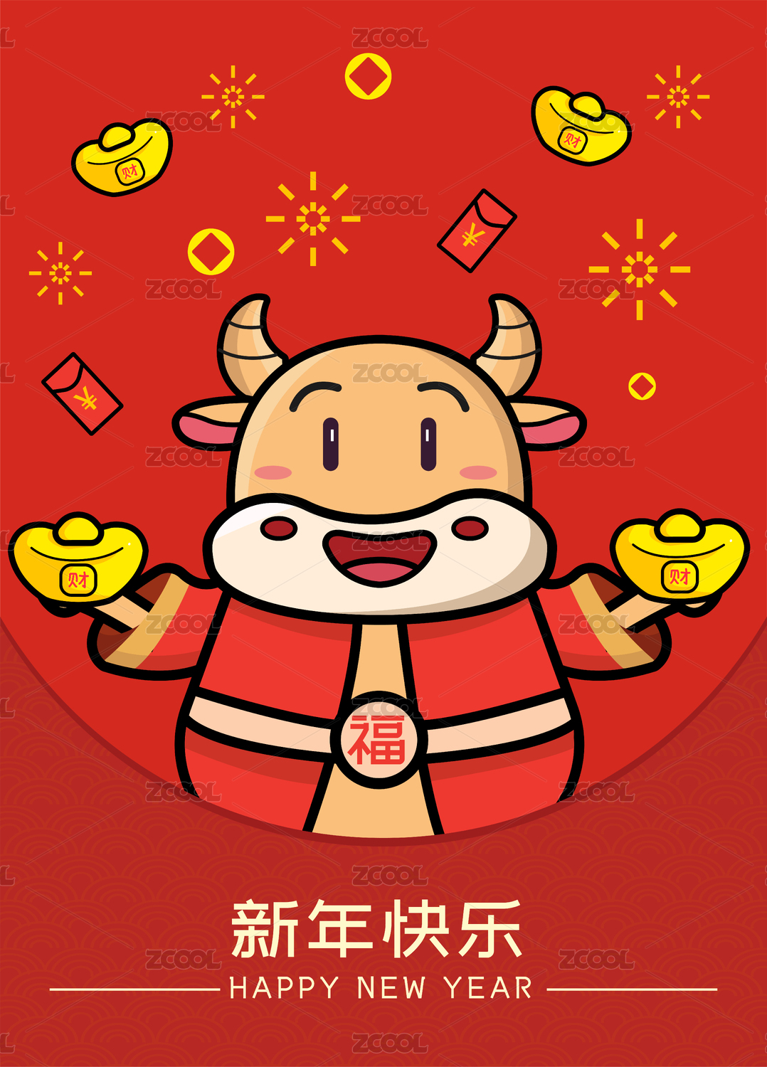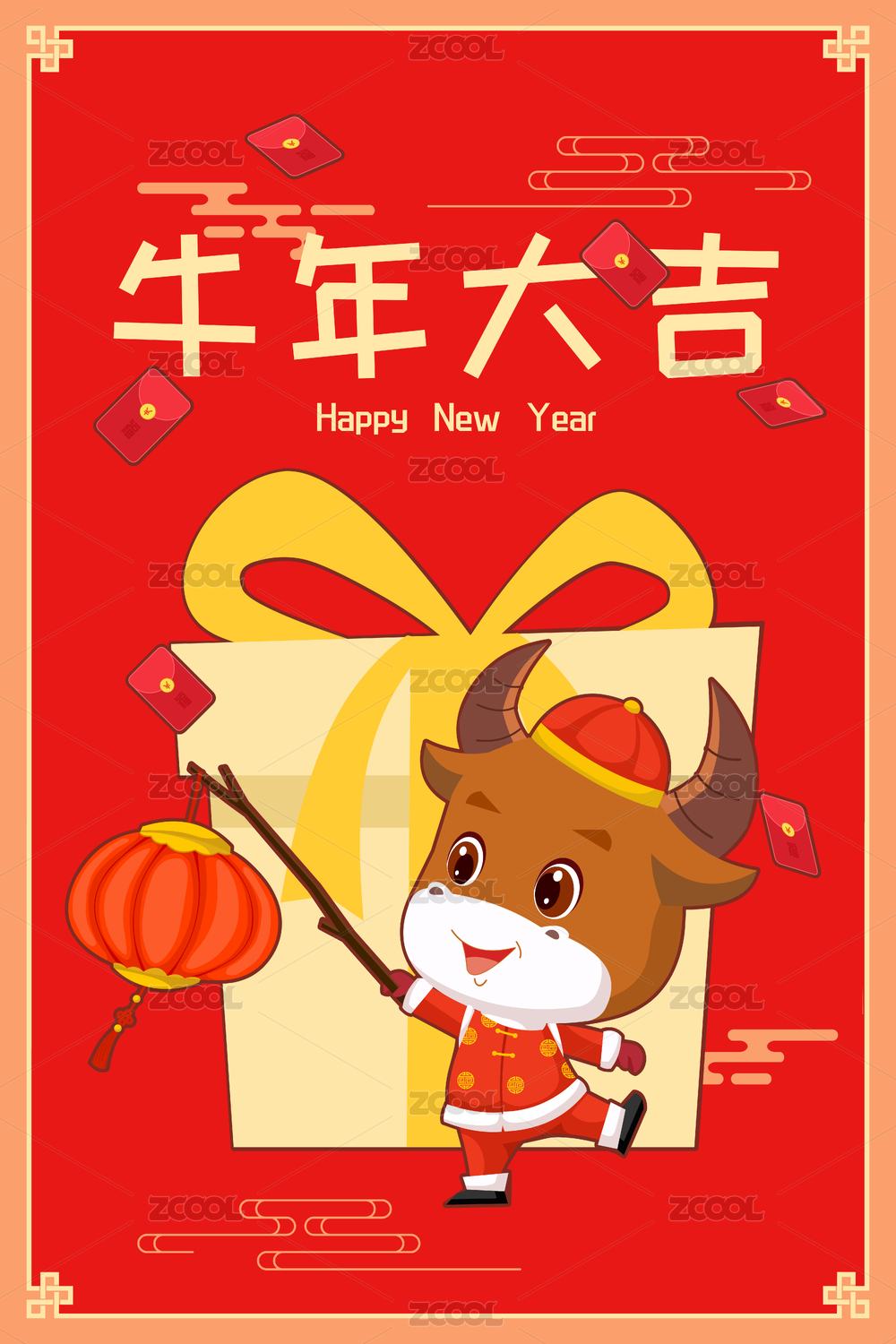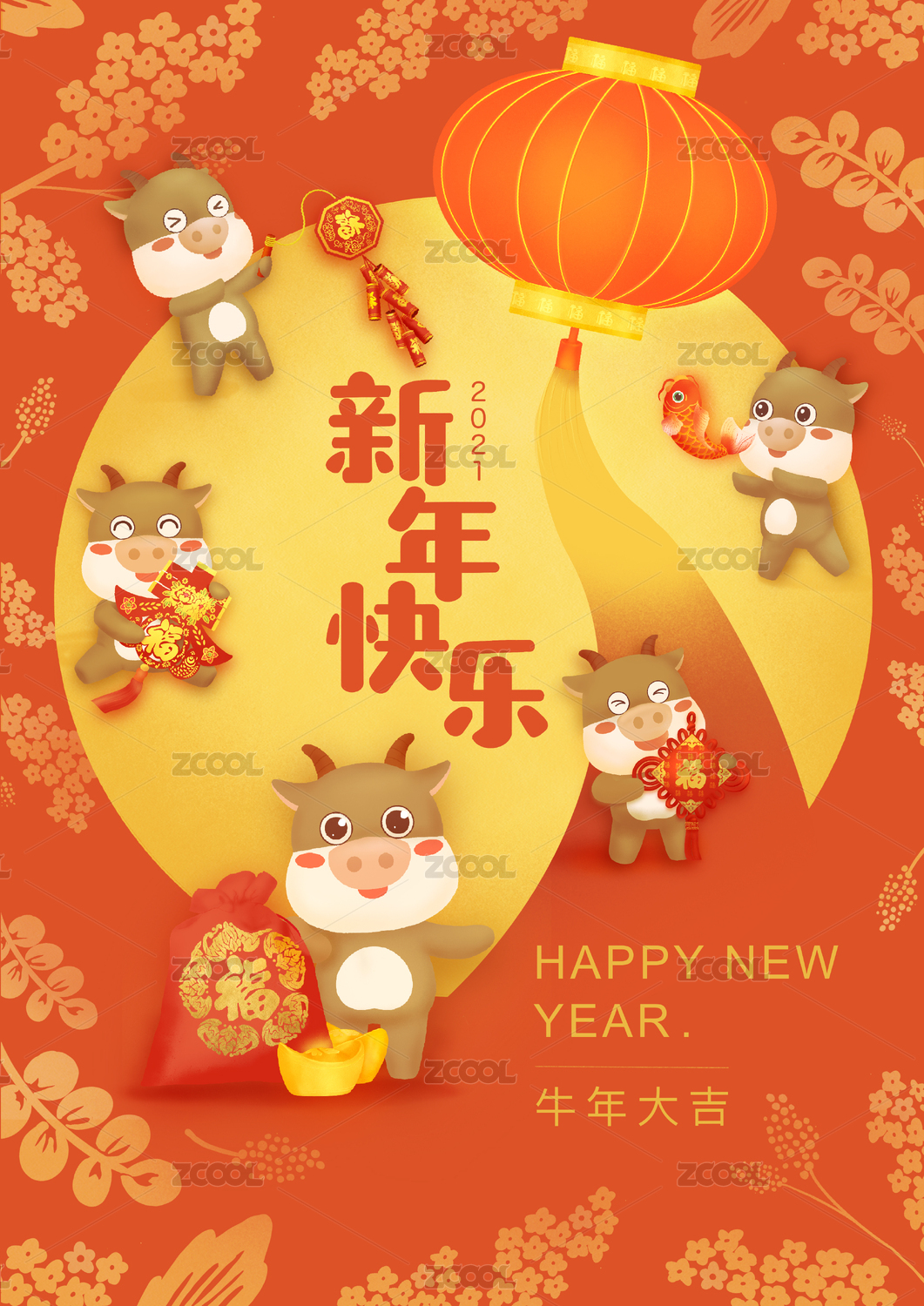 中国,传统节日,新年,牛,祝福,灯笼,福,鞭炮,元宝