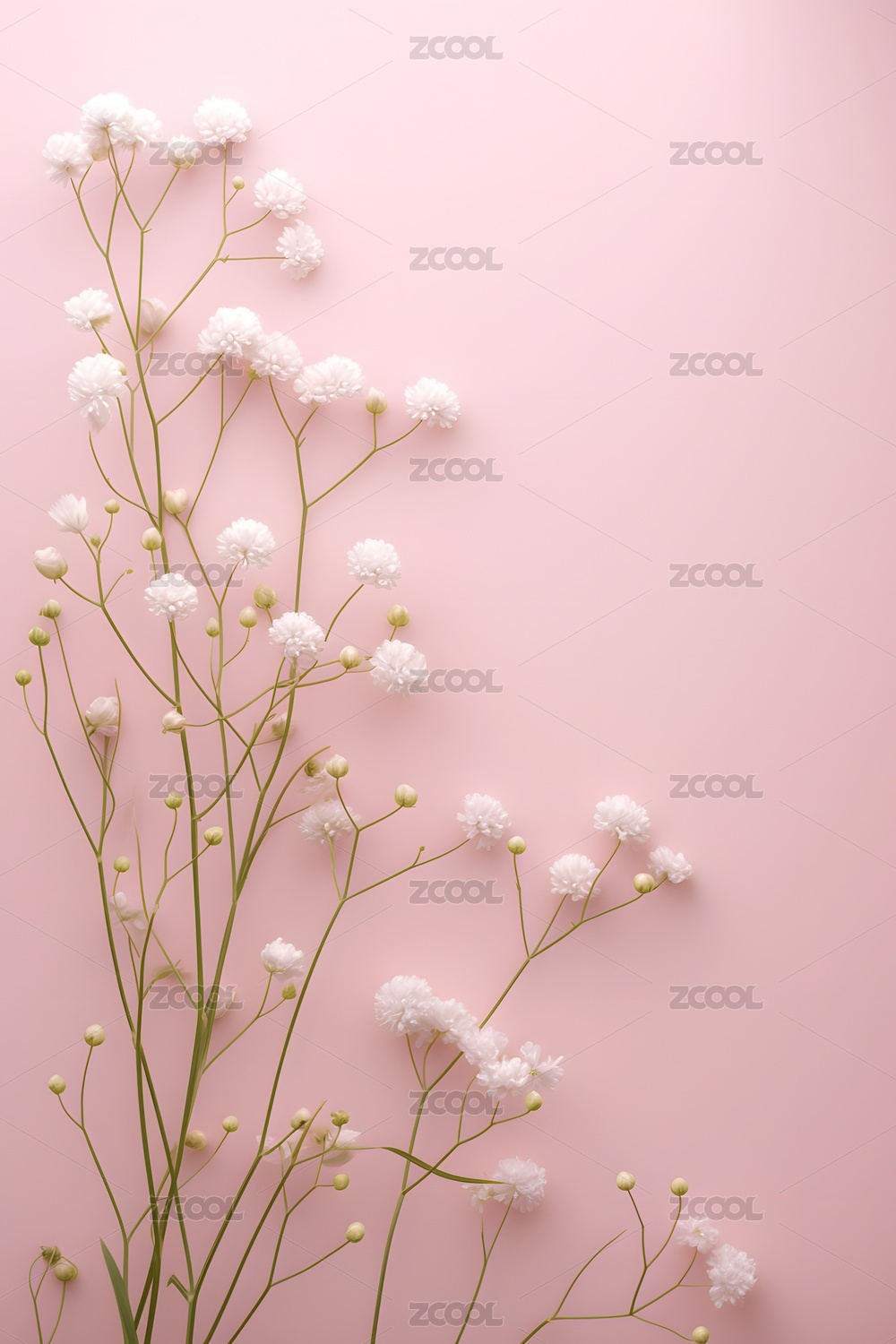 粉色背景下白色满天星花束的清新花卉摄影