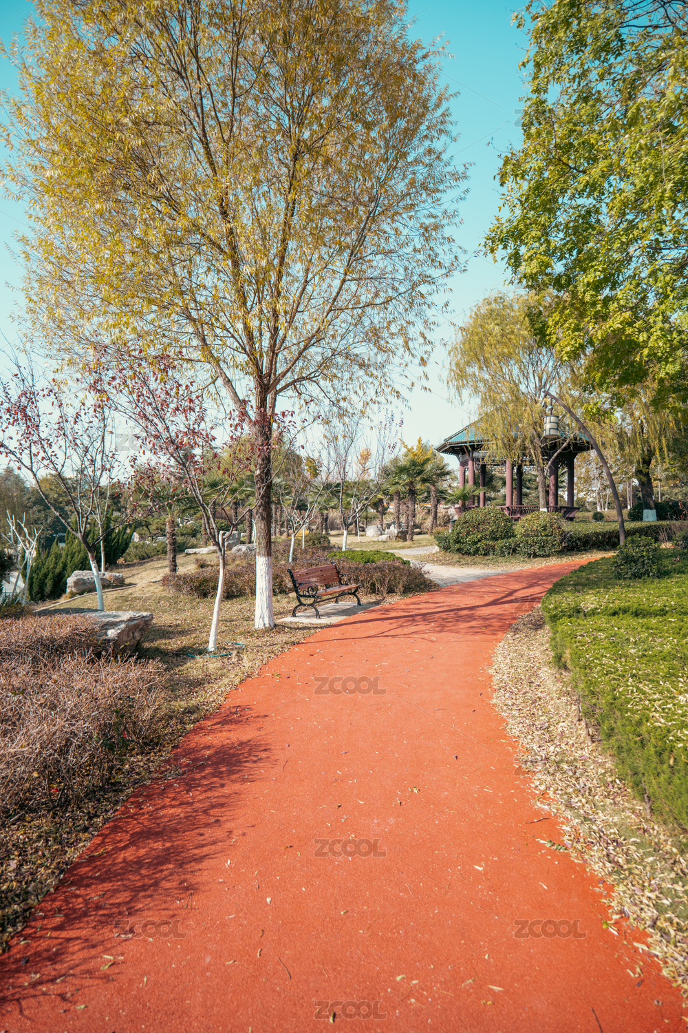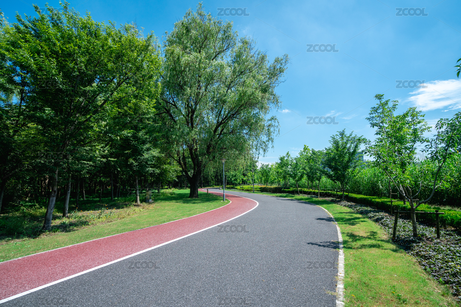 晴朗的天气,公园里的跑道与翠绿的绿植