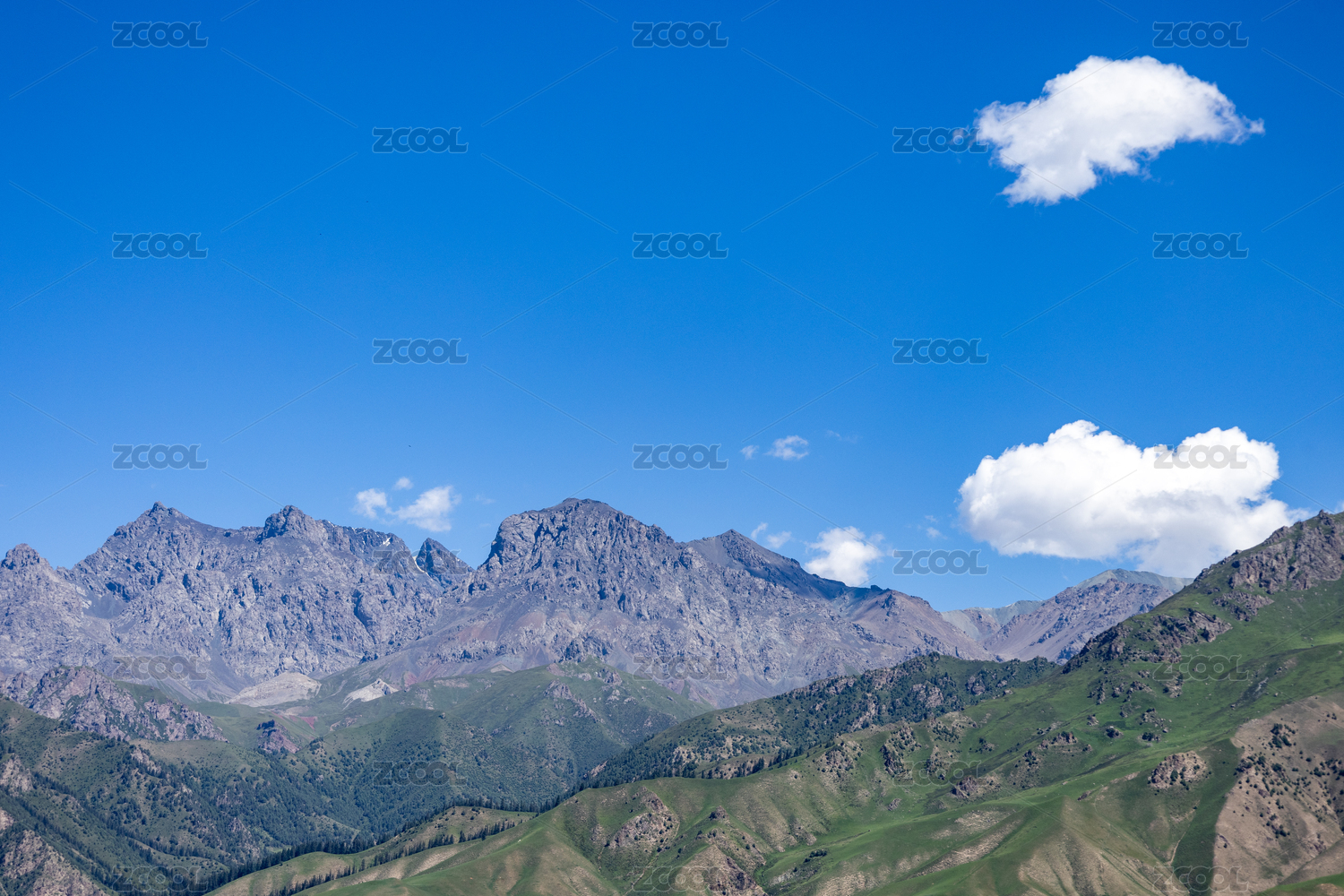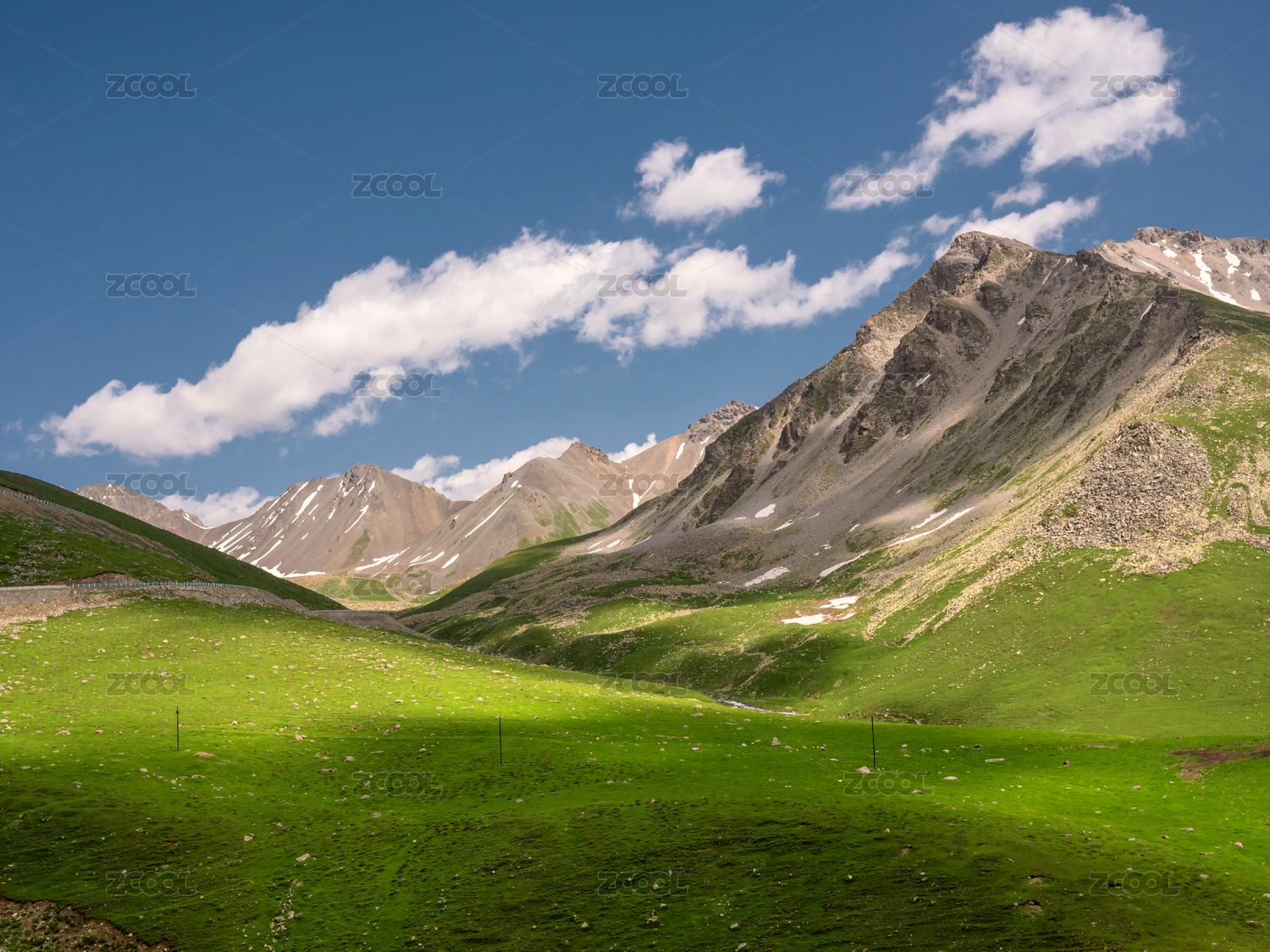 中国新疆夏季蓝天白云下G217独库公路沿途高山草原