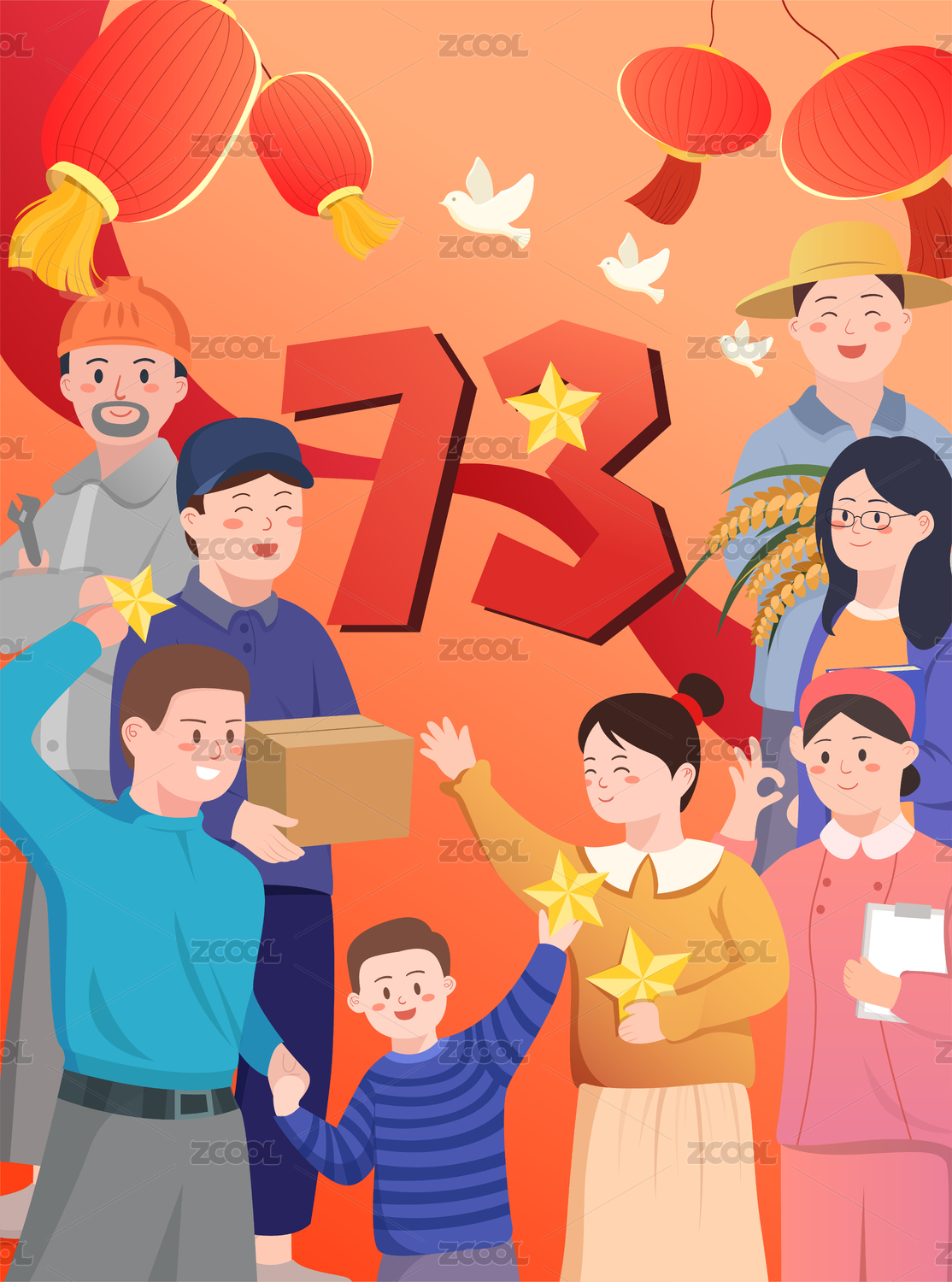 国庆节各个职业的人们在一起庆祝