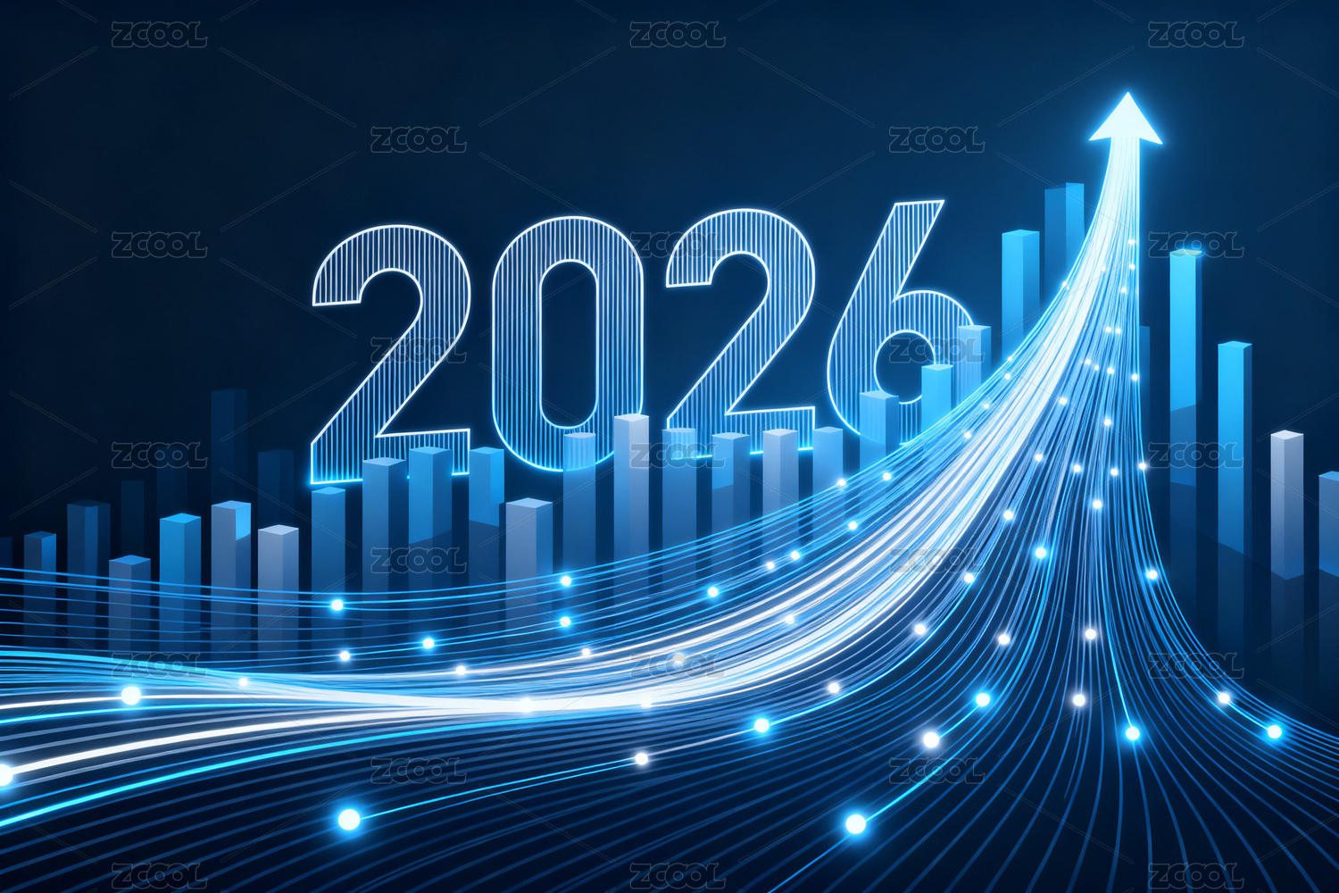 蓝色背景里的线条柱状图和2026