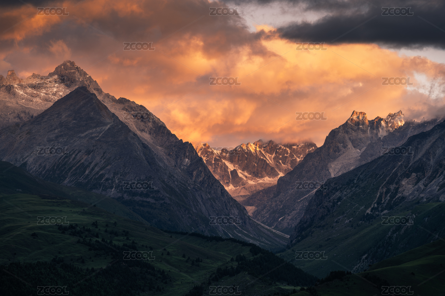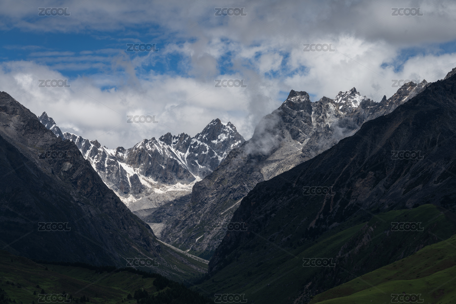中国新疆夏特峡谷的雪峰上云雾弥漫