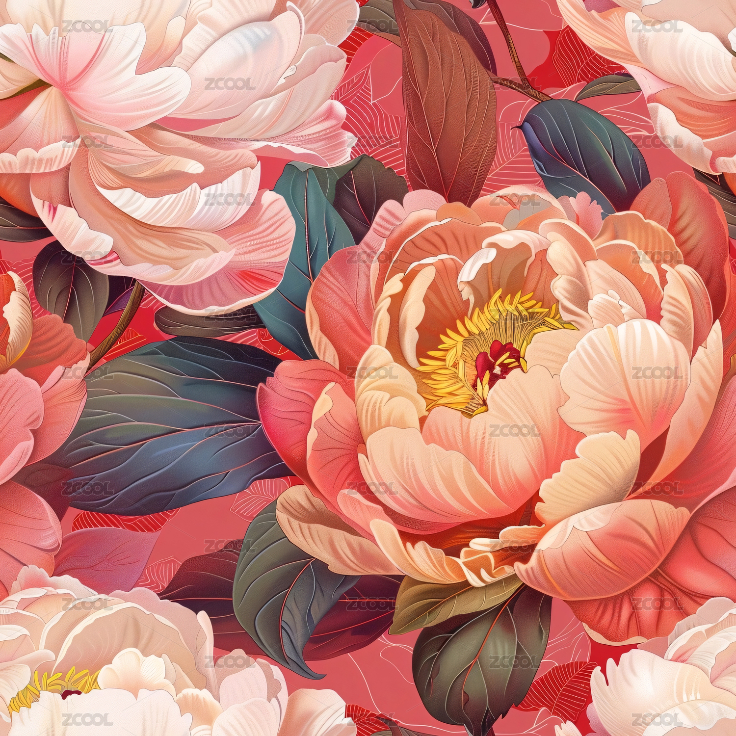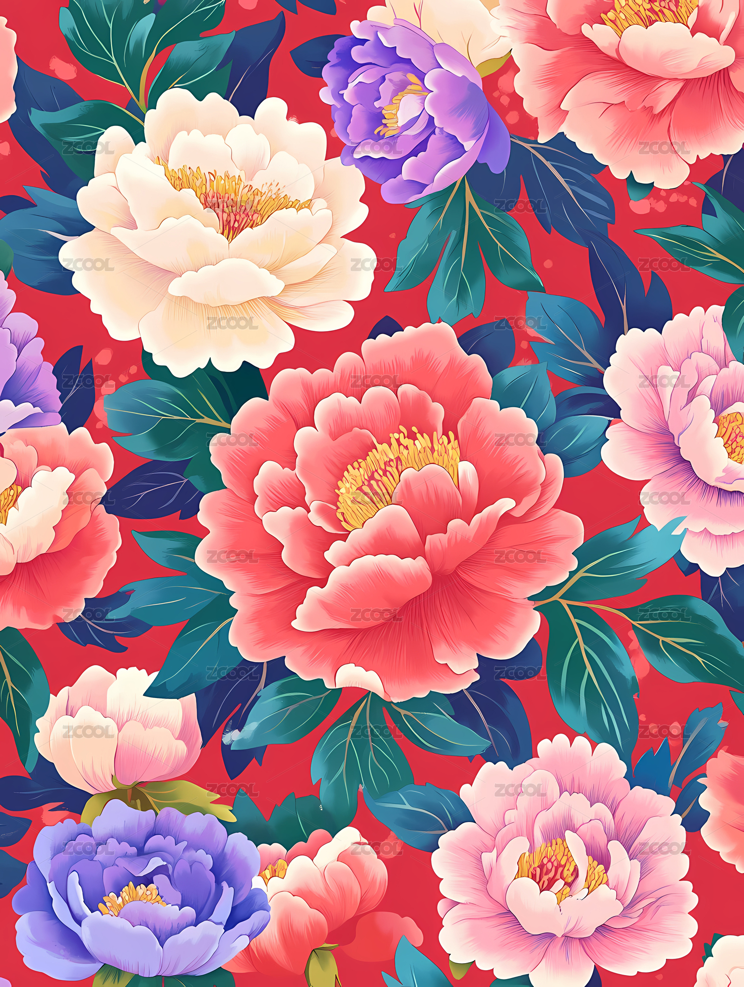 红色背景上多彩绽放的牡丹花
