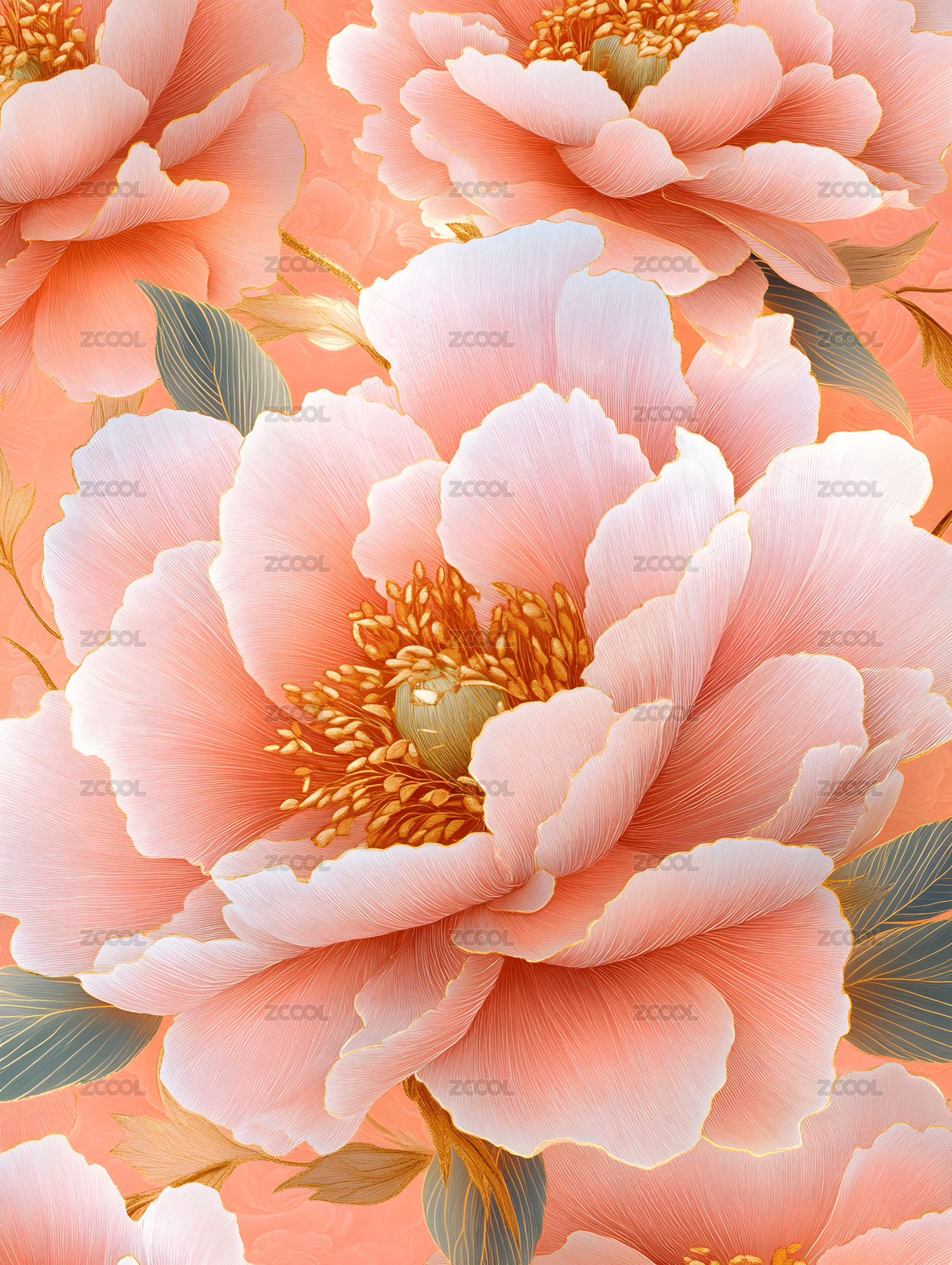 数码复古金色牡丹花卉装饰抽象图形海报背景