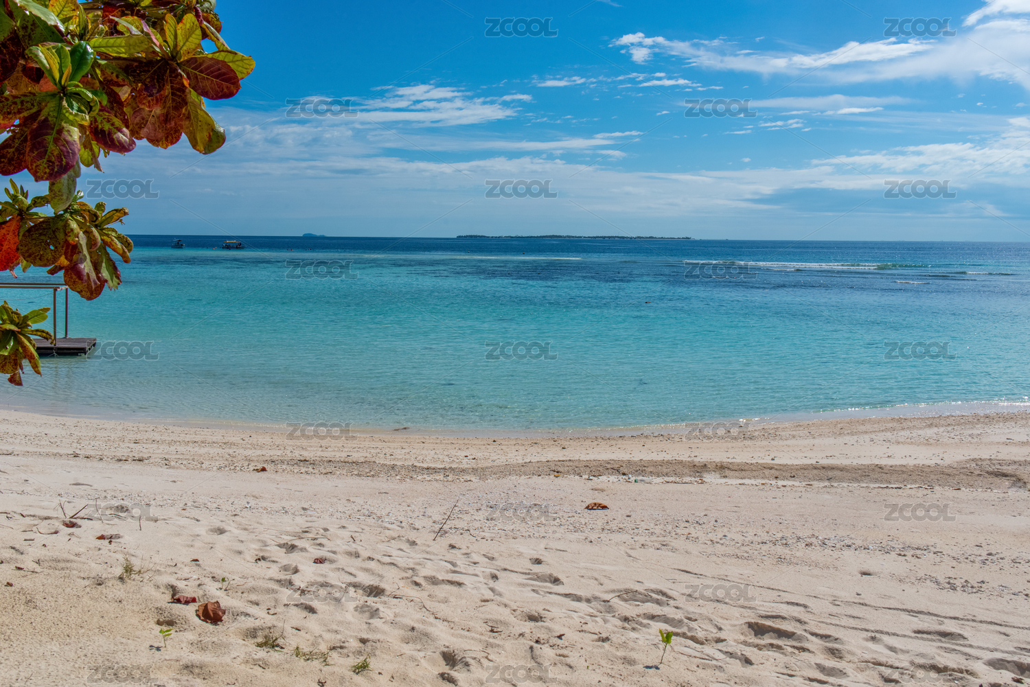 马来西亚沙巴州斗湖市仙本那邦邦岛景区 树叶前景的蓝天白云与大海沙滩
