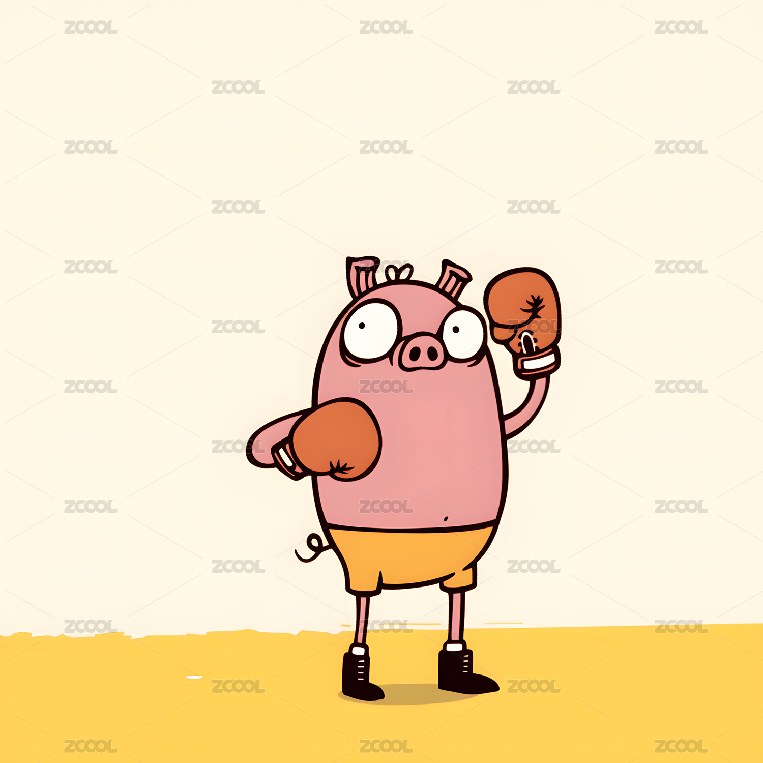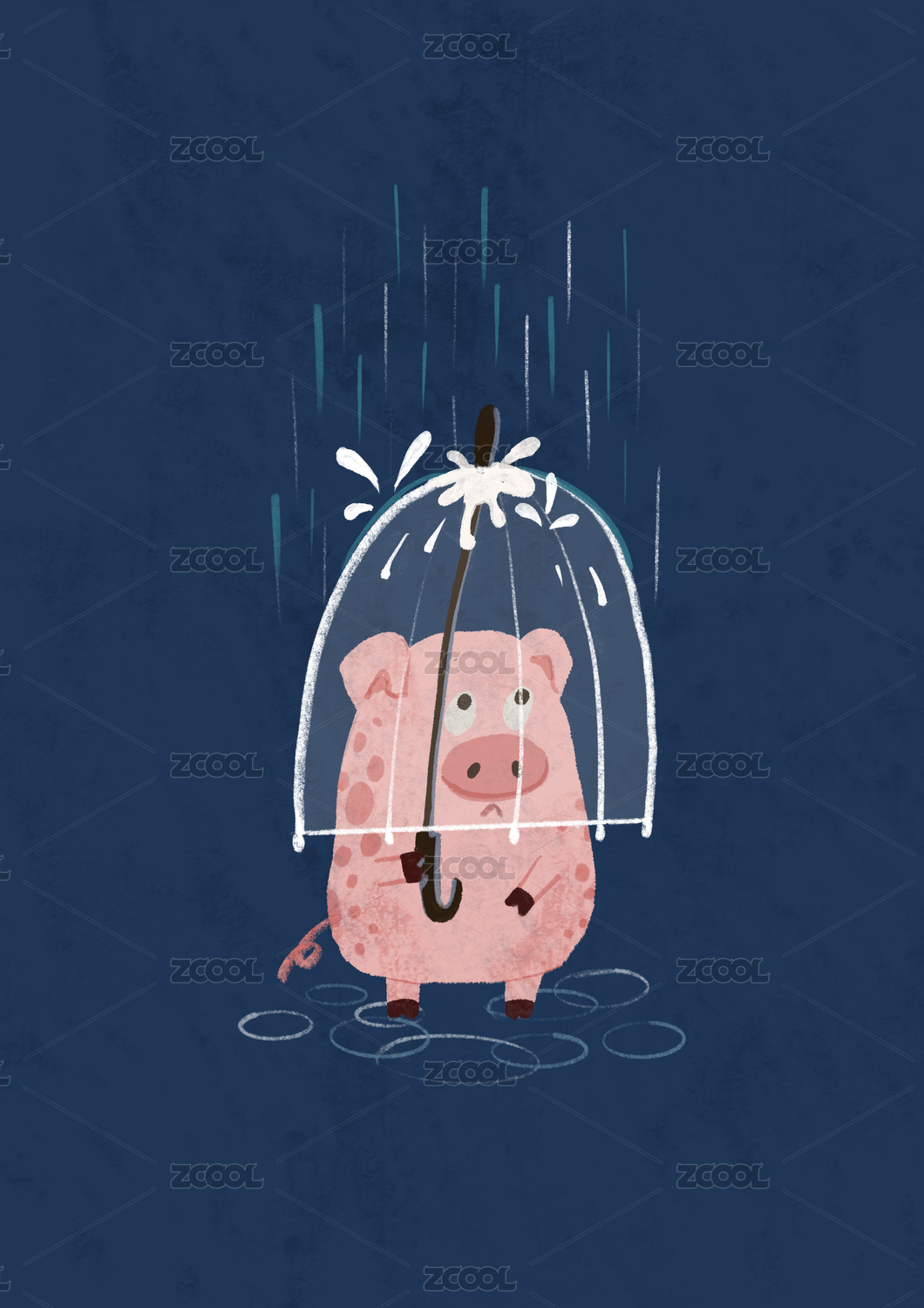 可爱粉色小猪撑着伞在雨中,扁平儿童插画