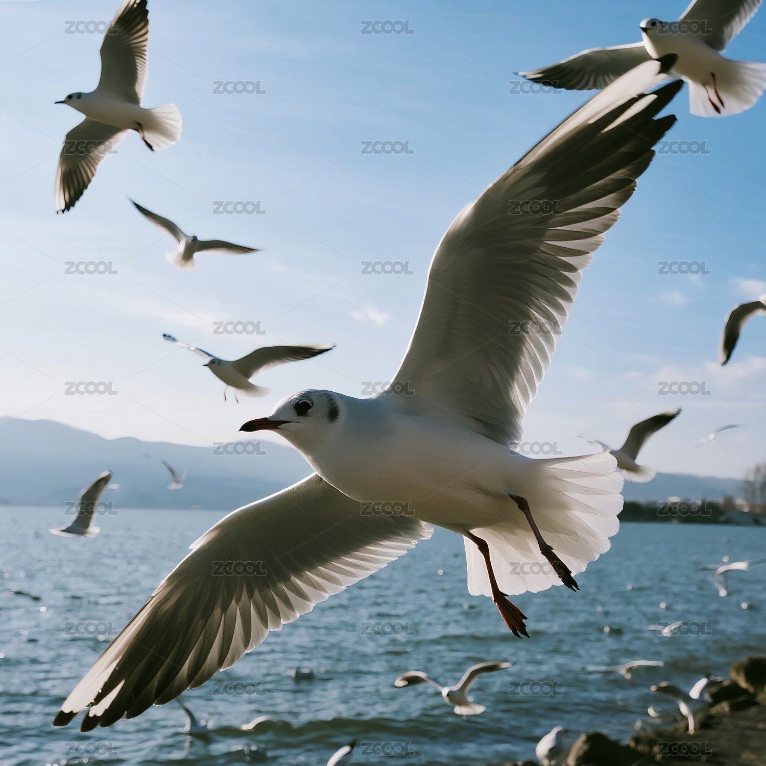 湛蓝的湖水上一群自由飞翔的红嘴鸥