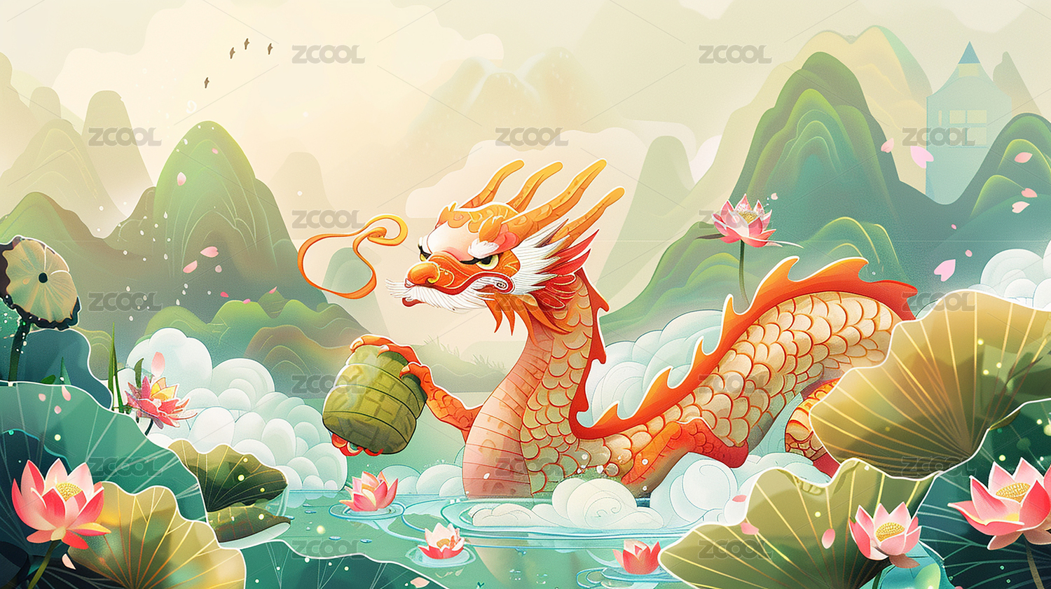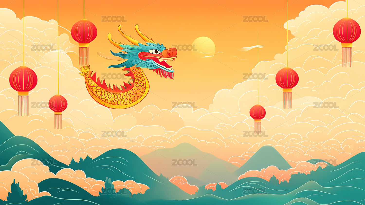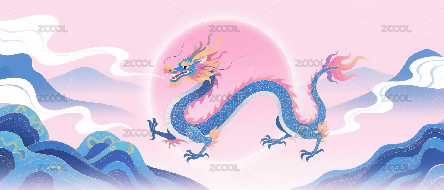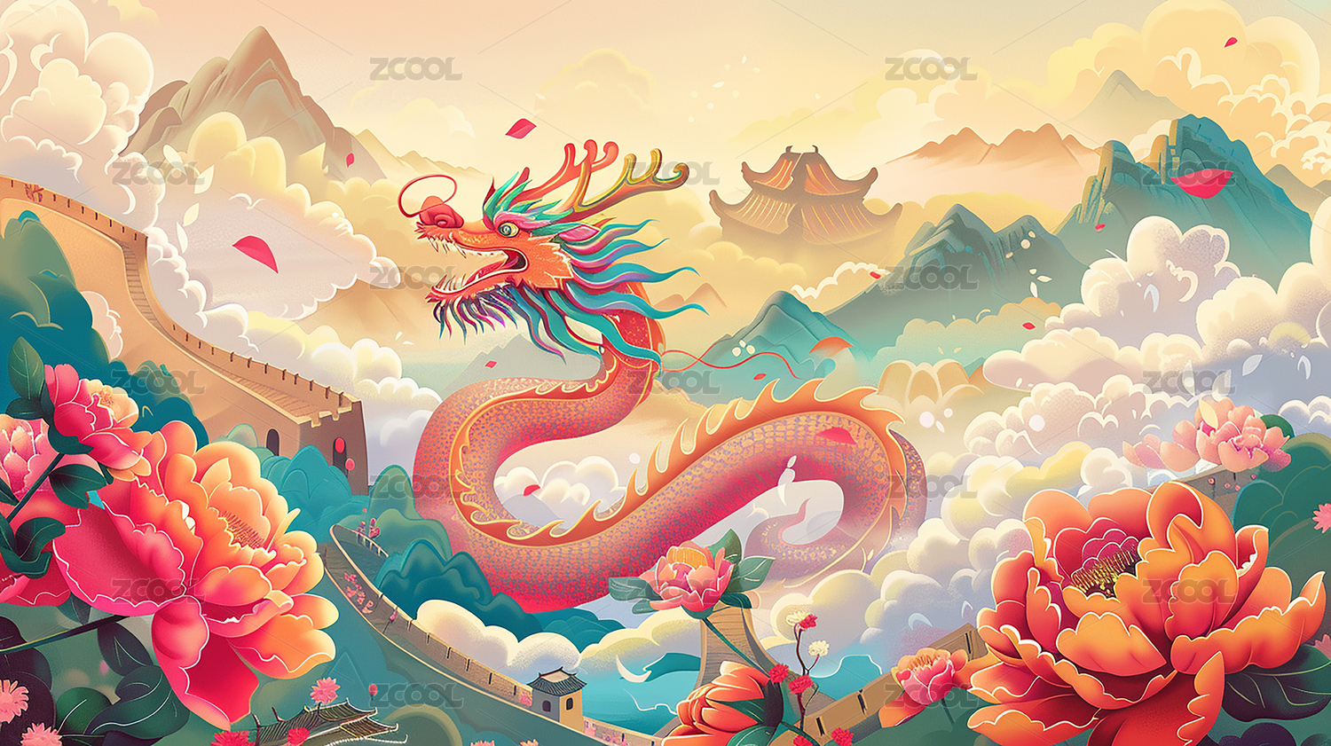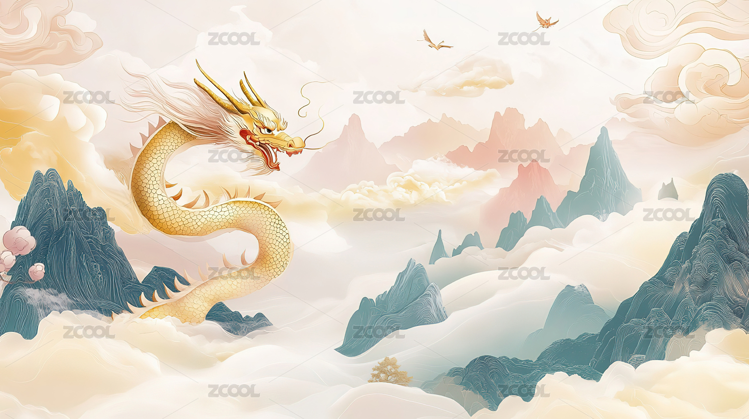 龙抬头,龙年,龙,桃花,山脉,祥云,青山,云朵,阳光,春天