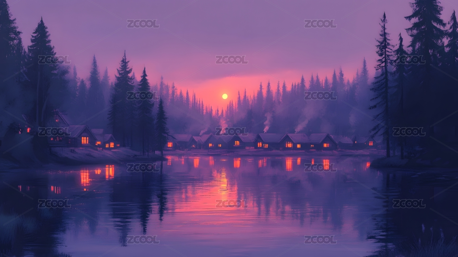 夕阳下宁静的湖边小屋
