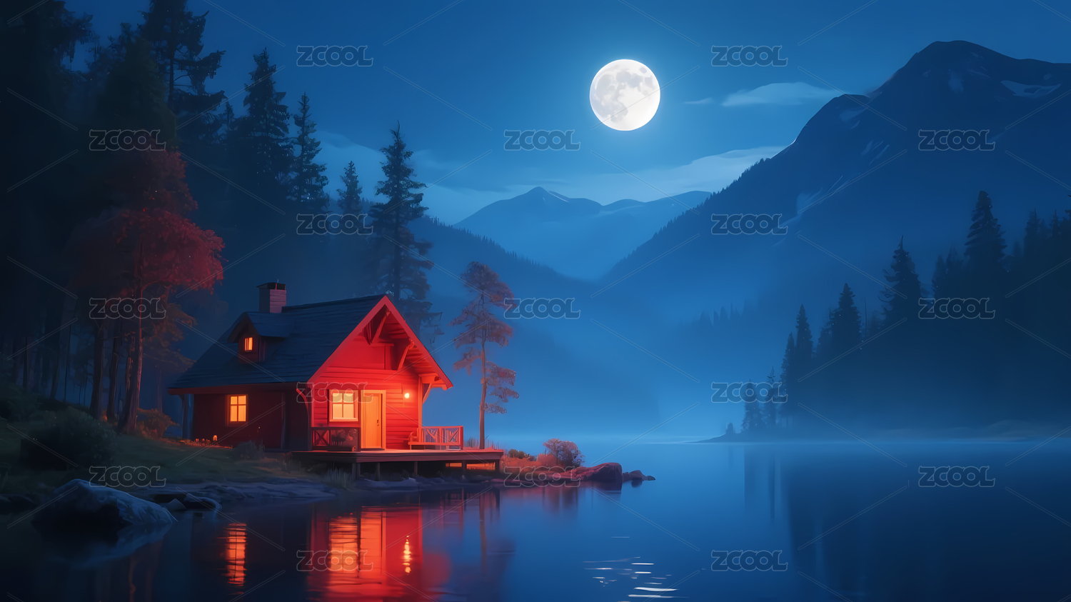 红色小屋夜晚山景湖水