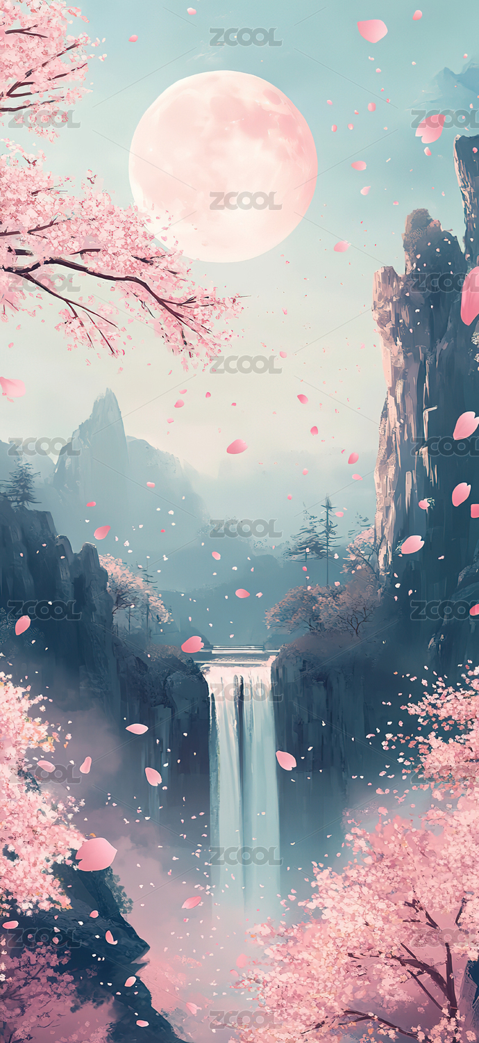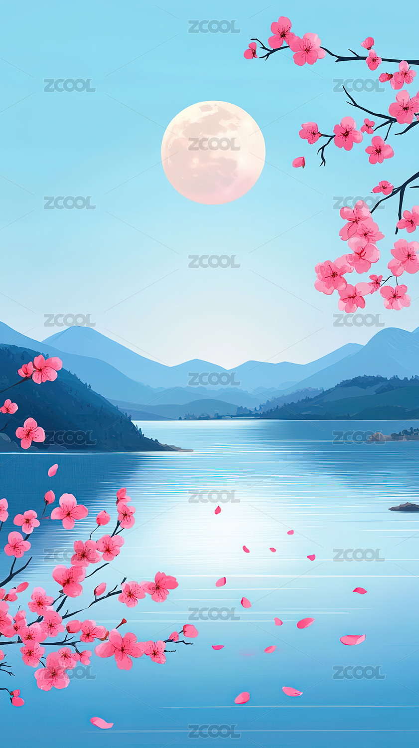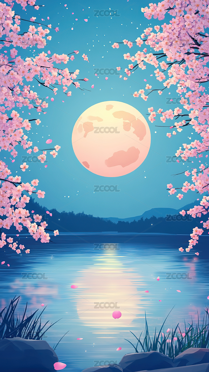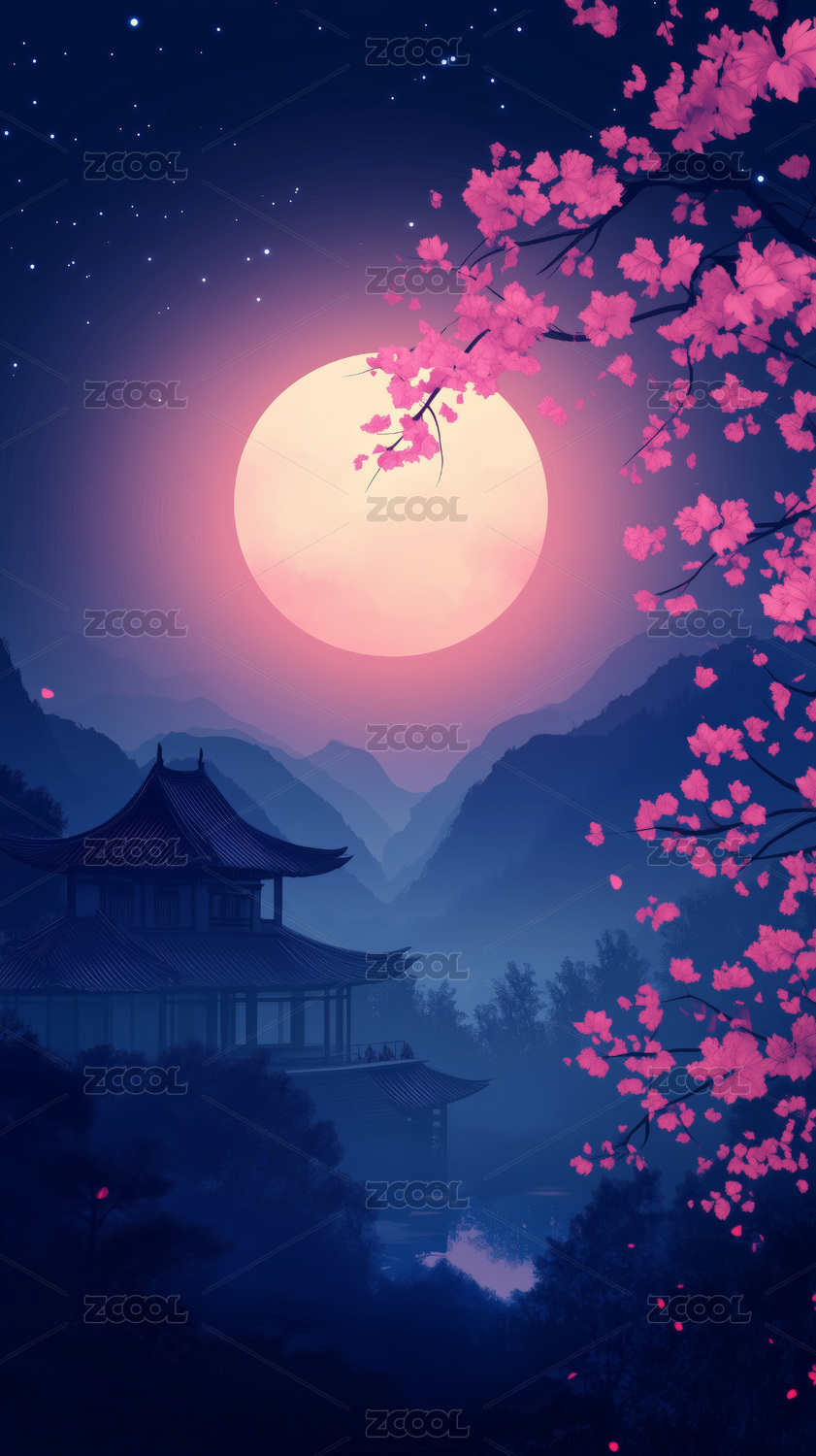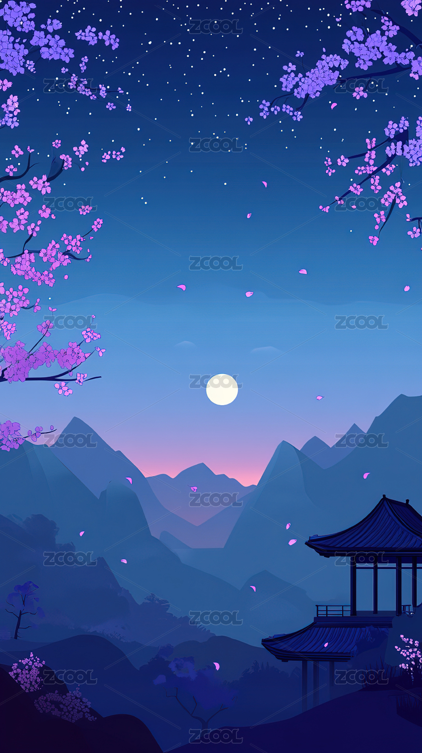 夜晚星空下,月亮将月光撒在山峰上背景插画