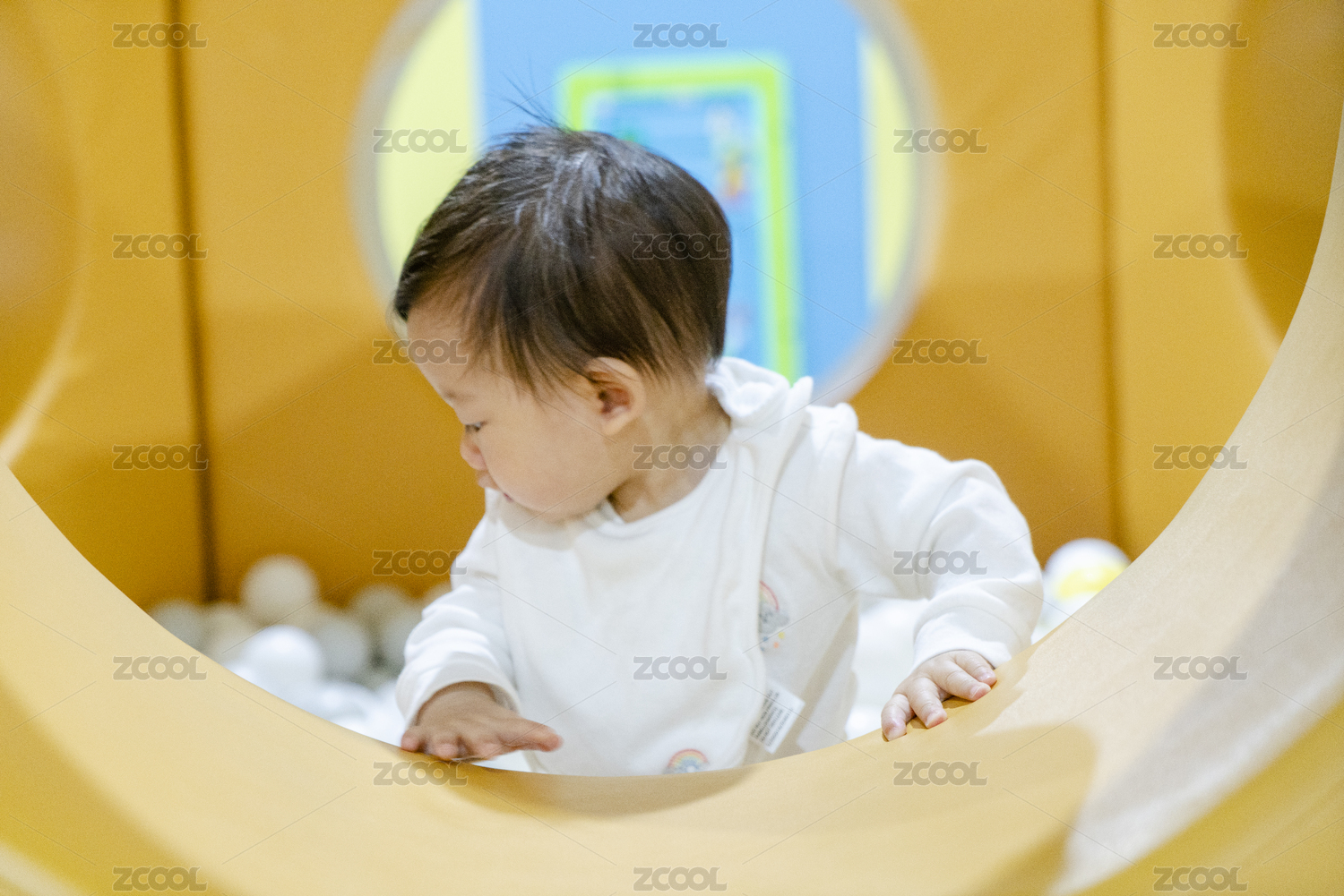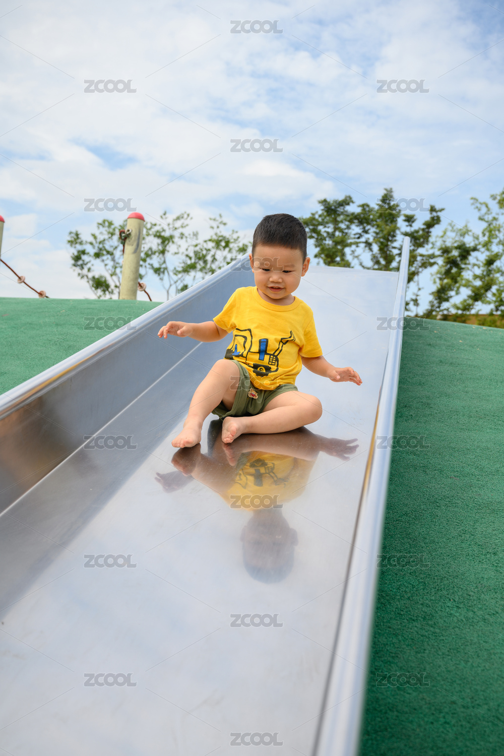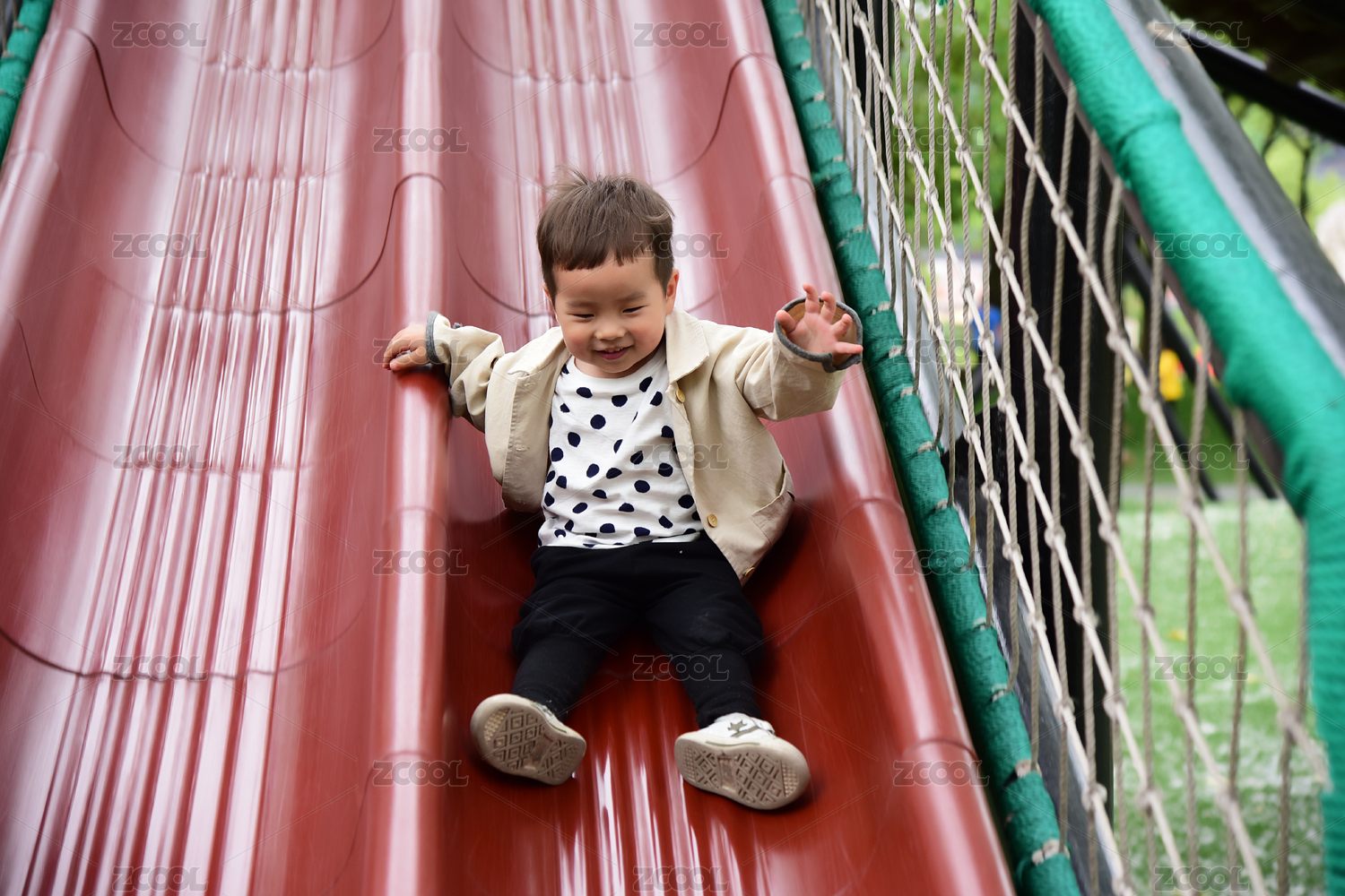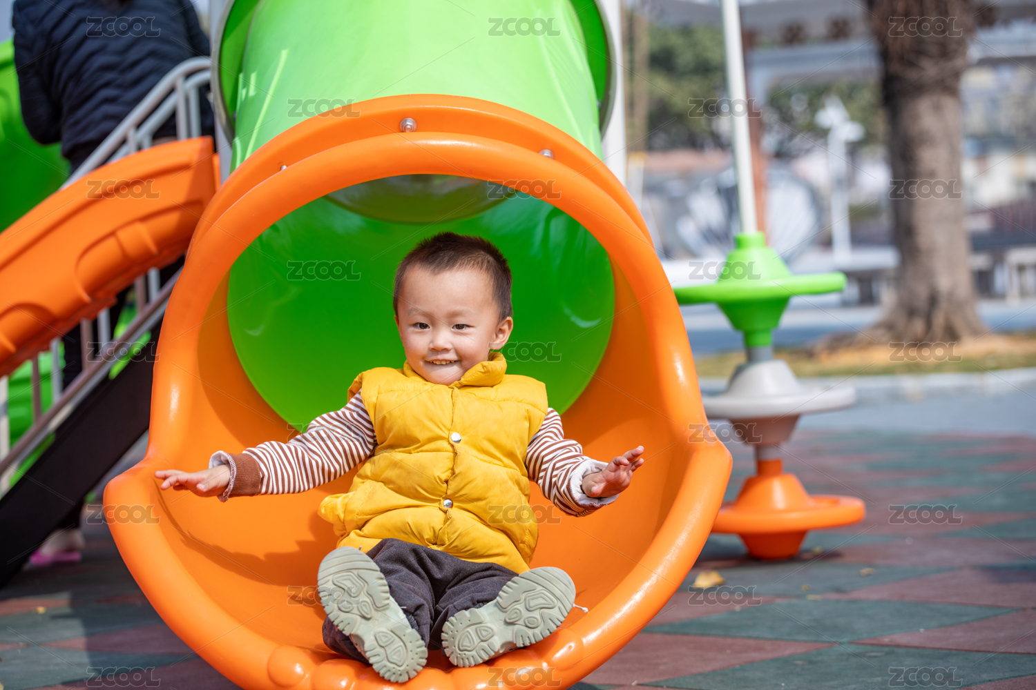 4月春天,3岁男童在室外儿童乐园快乐玩耍