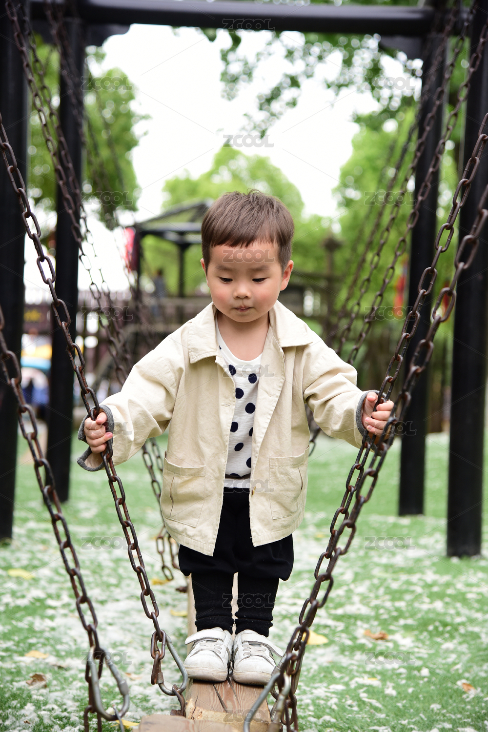 林荫古建筑背景下站在晃动铁链木桥上手扶着铁链玩耍的小男孩