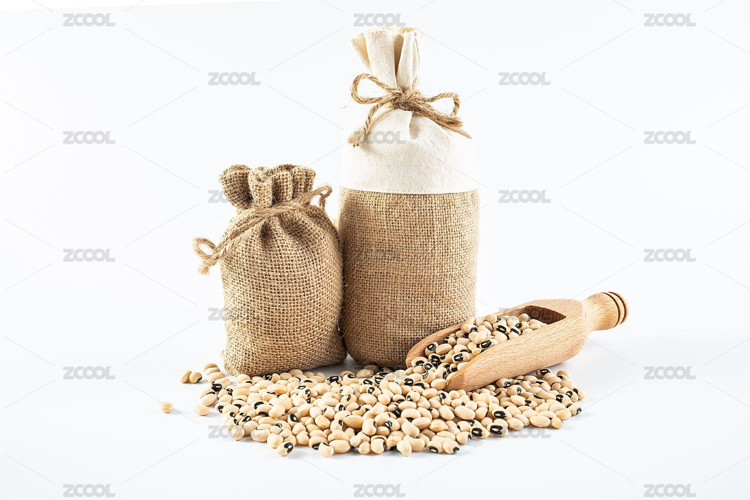 装满粮食的麻袋和一木铲燕麦仁在白背景上