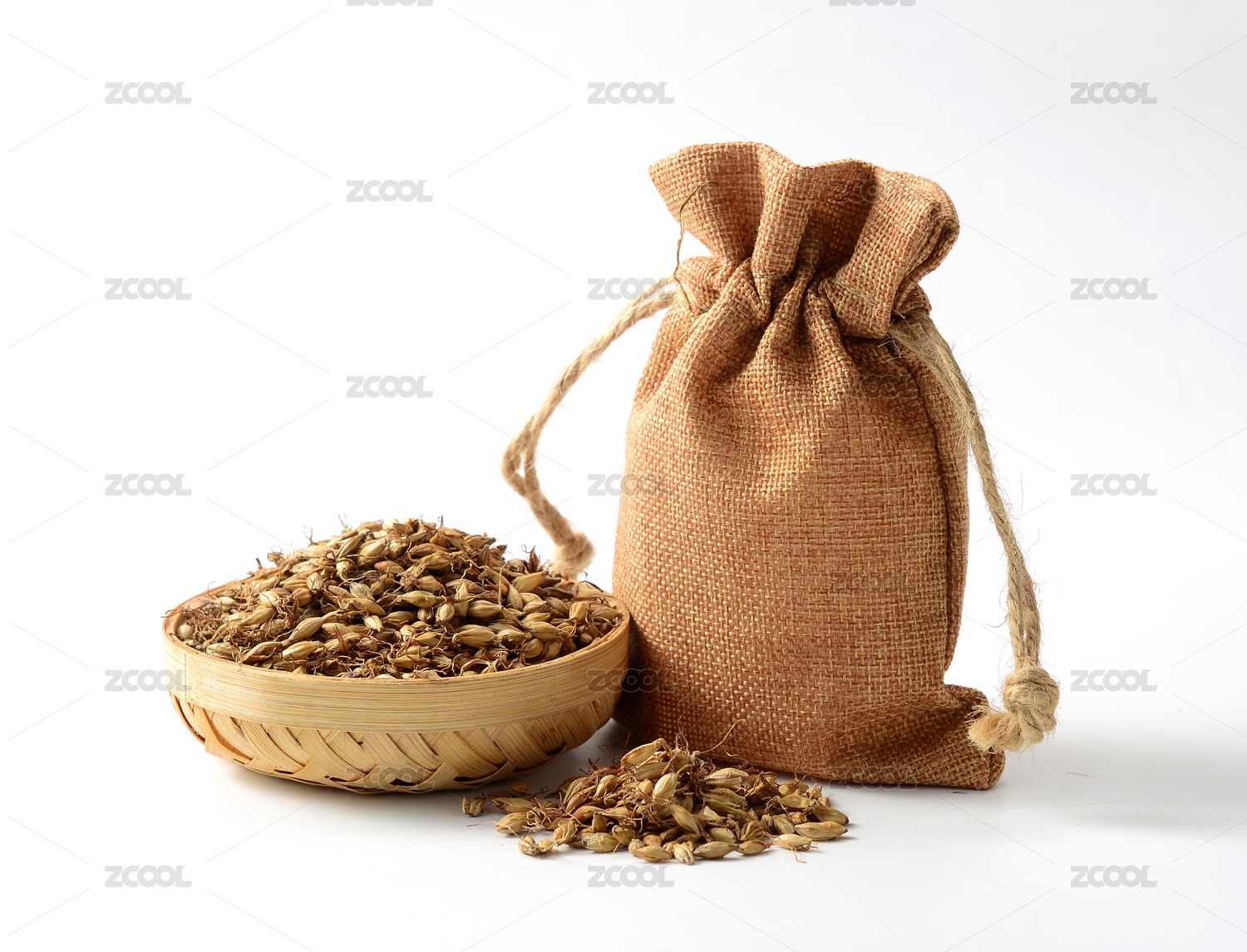 装满粮食的麻袋和一碗小麦仁在白背景上