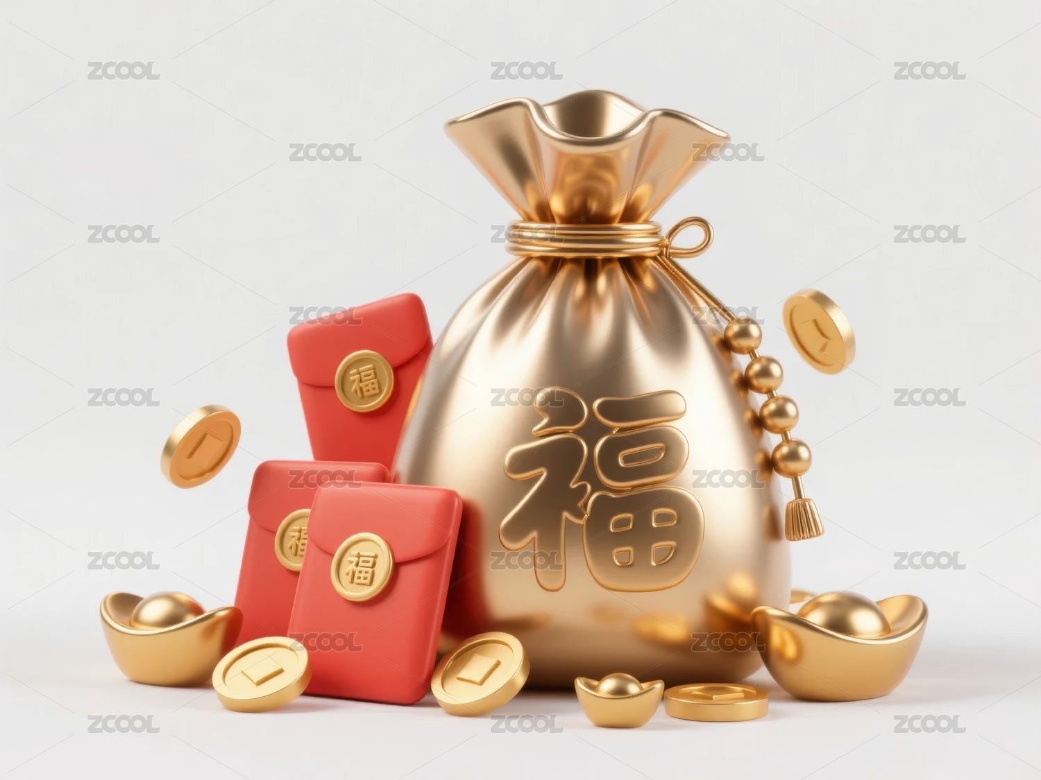三维渲染的中国风福袋和金币