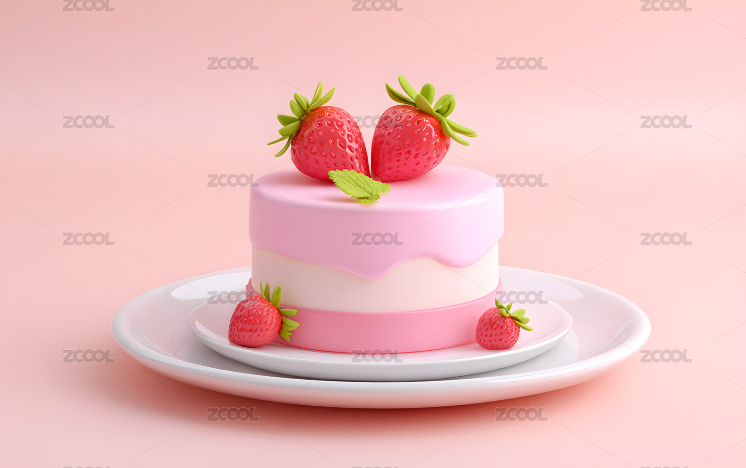 盘子上切开的水果奶油蛋糕3D卡通食品插画