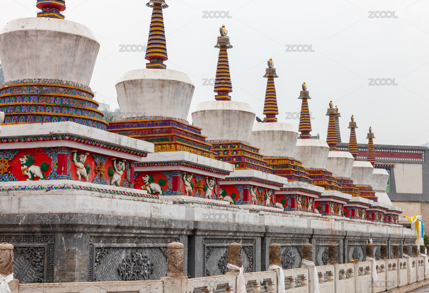天空下青海省湟中塔尔寺入口处的的白色菩提塔