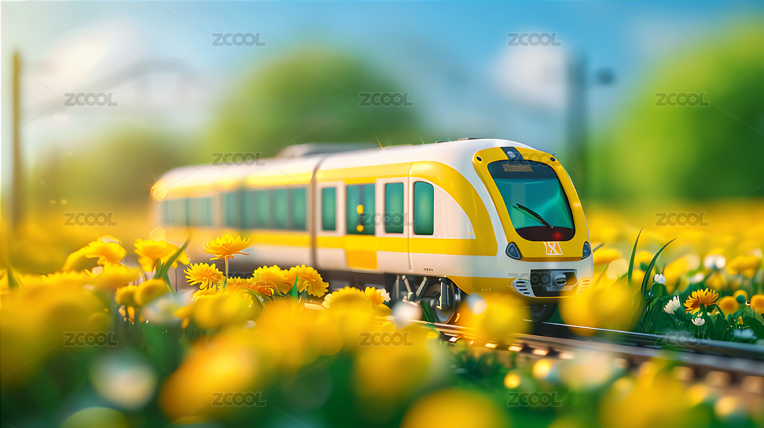 黄色,火车,铁路,花海,绿色,草地,蓝天,白云,阳光,树木