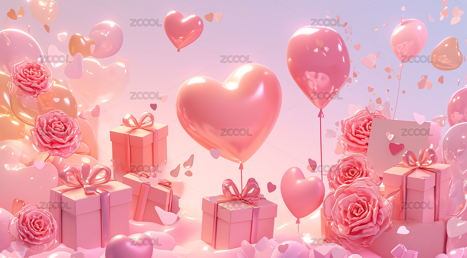 三维浪漫情人节爱心气球与礼物