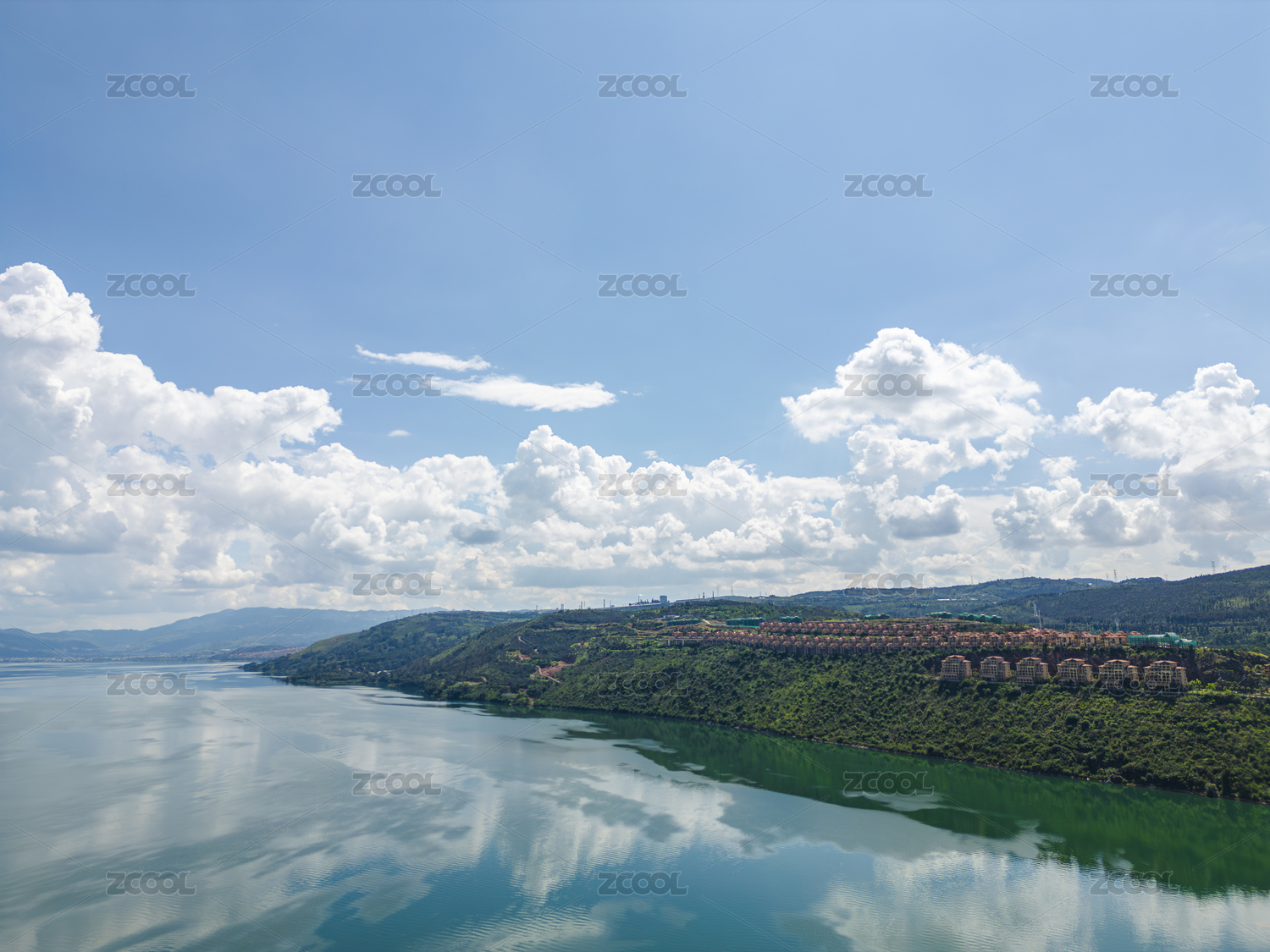 航拍蓝天白云下的云南抚仙湖及湖岸景色