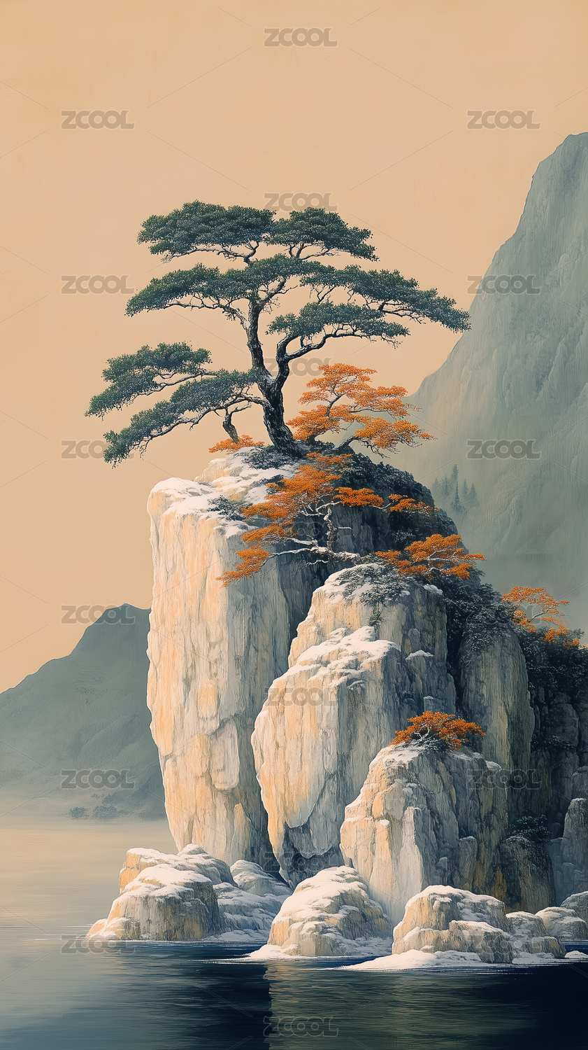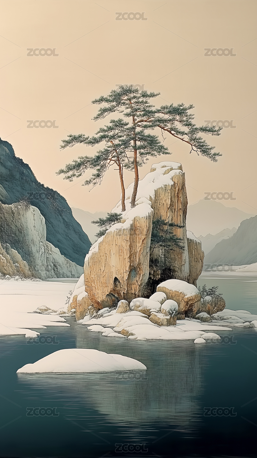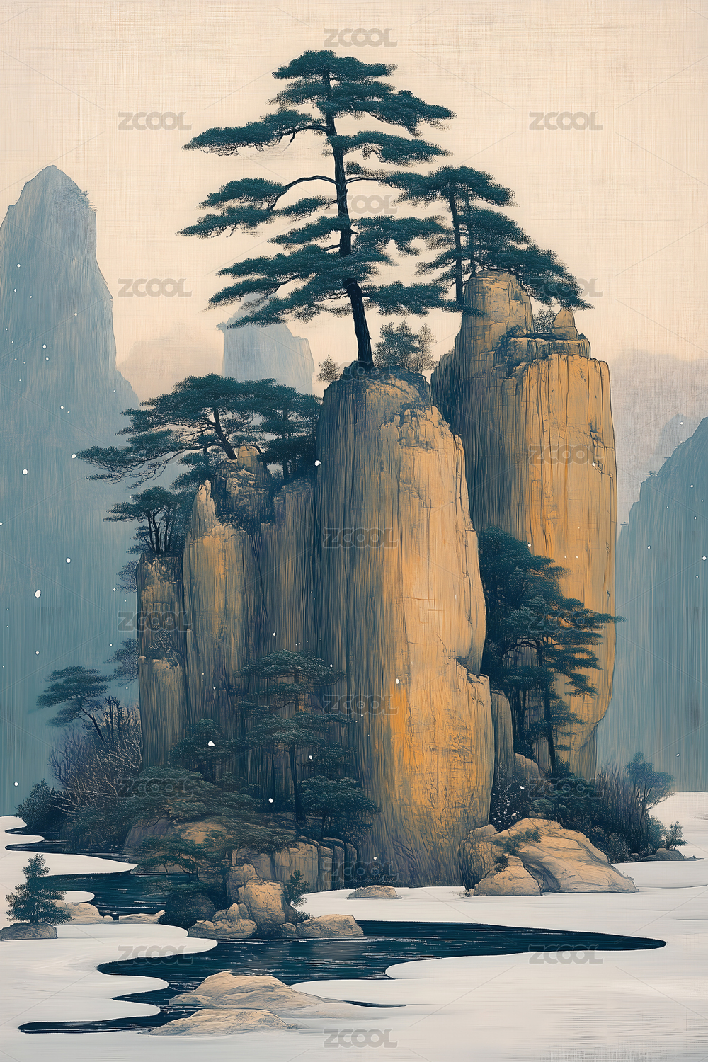 山水画,雪景,中国风,冬天,山,水,立体,新中式,大寒,小寒