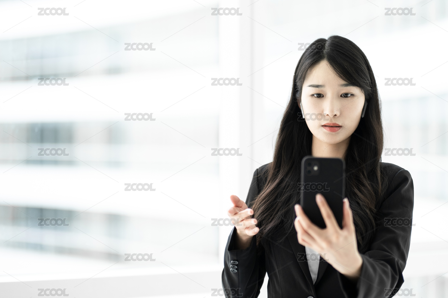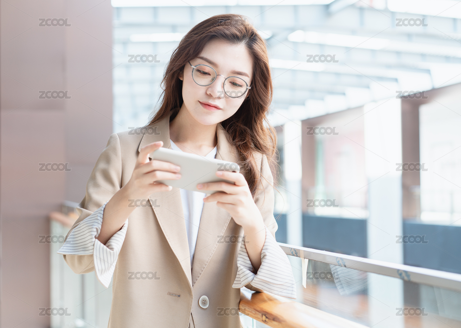 年轻亚洲商务人士倚靠在室内栏杆旁看手机