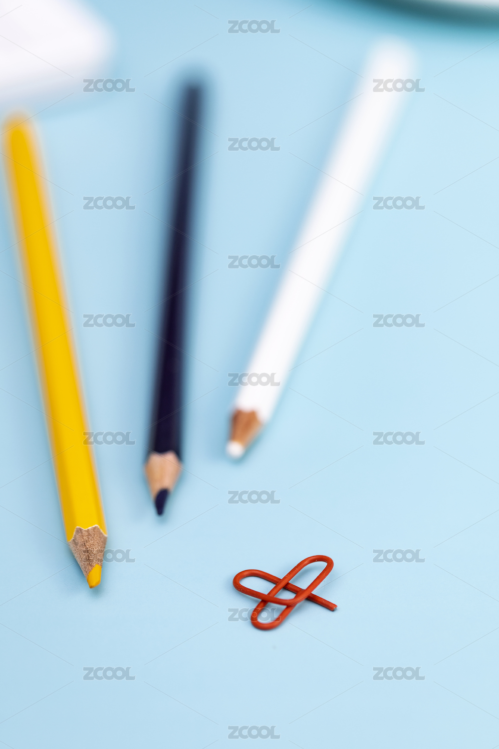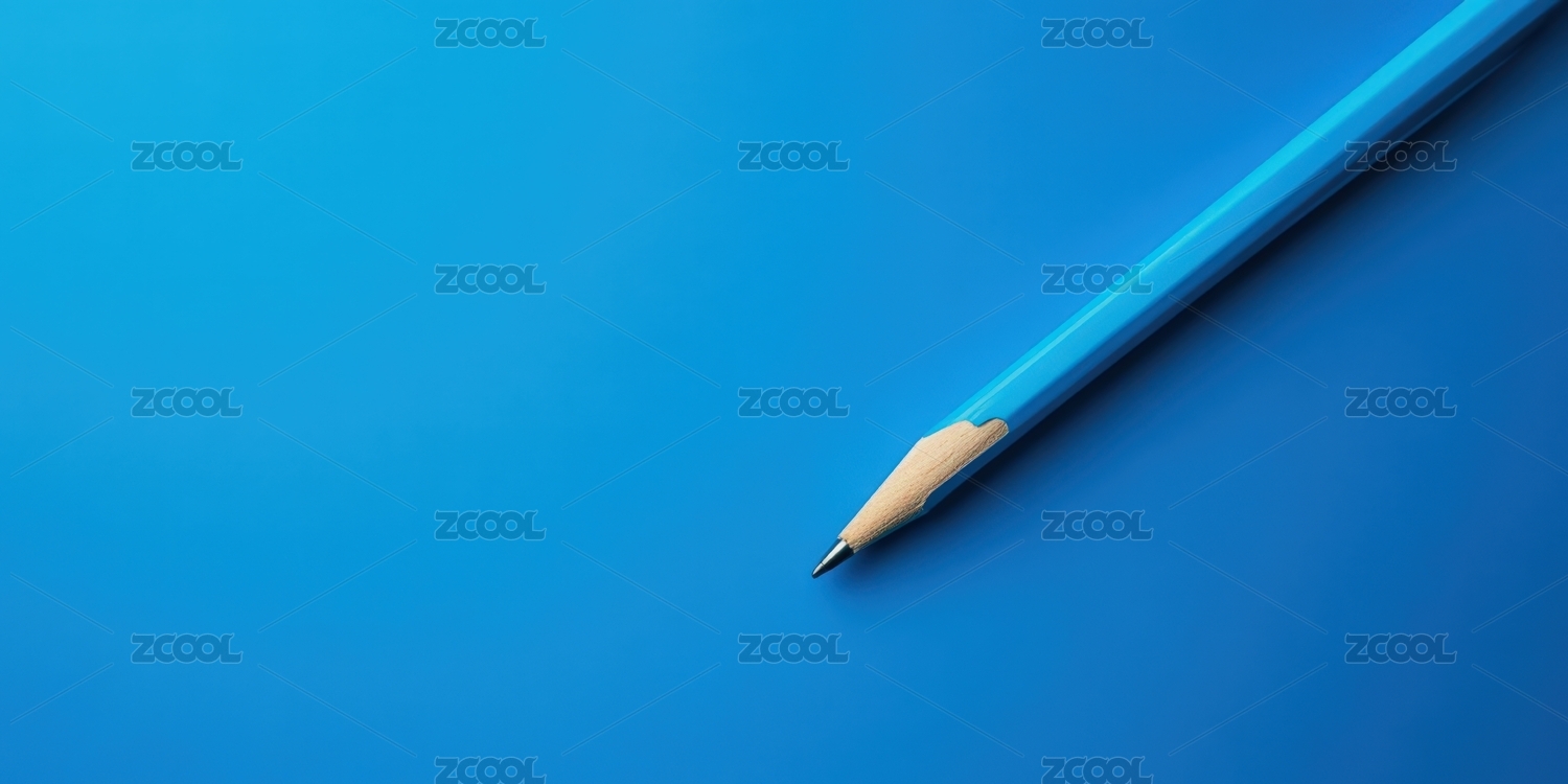 正上方蓝色背景下的螺旋笔记本和铅笔照片