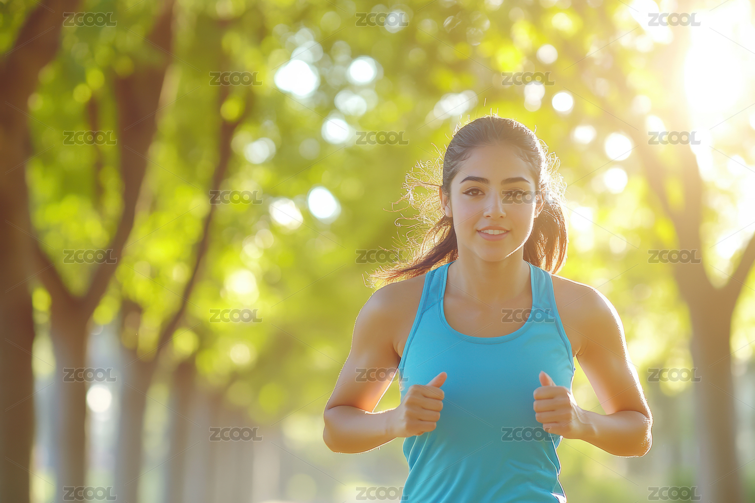 绿道上向着阳光晨跑健身的年轻亚洲女生