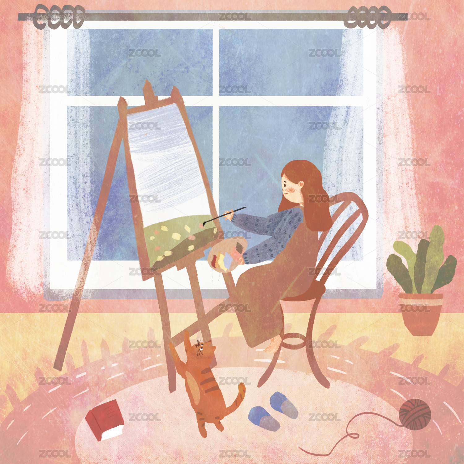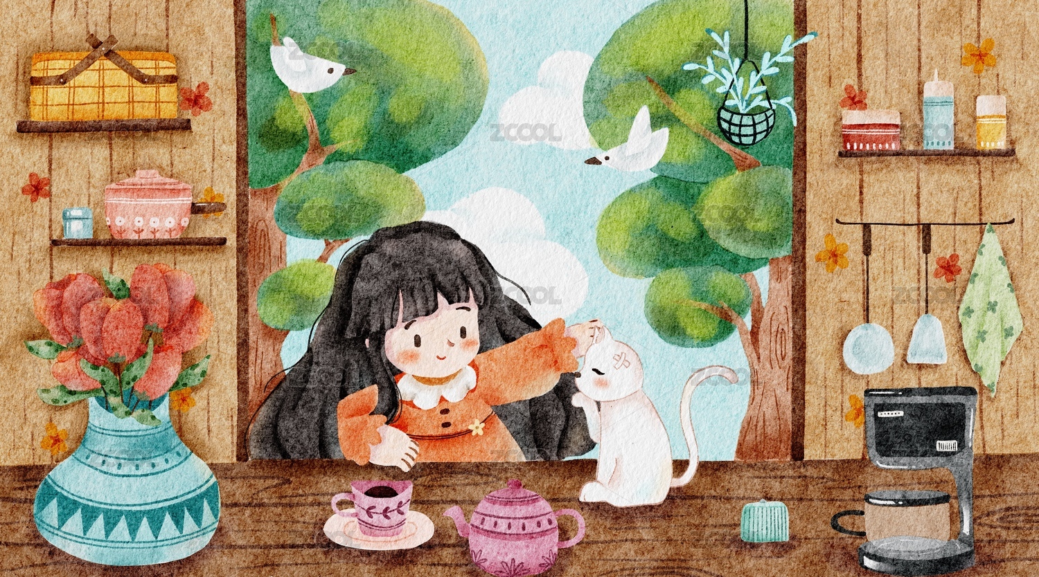 在阳台看窗外的猫一起喝水的健康养生女孩